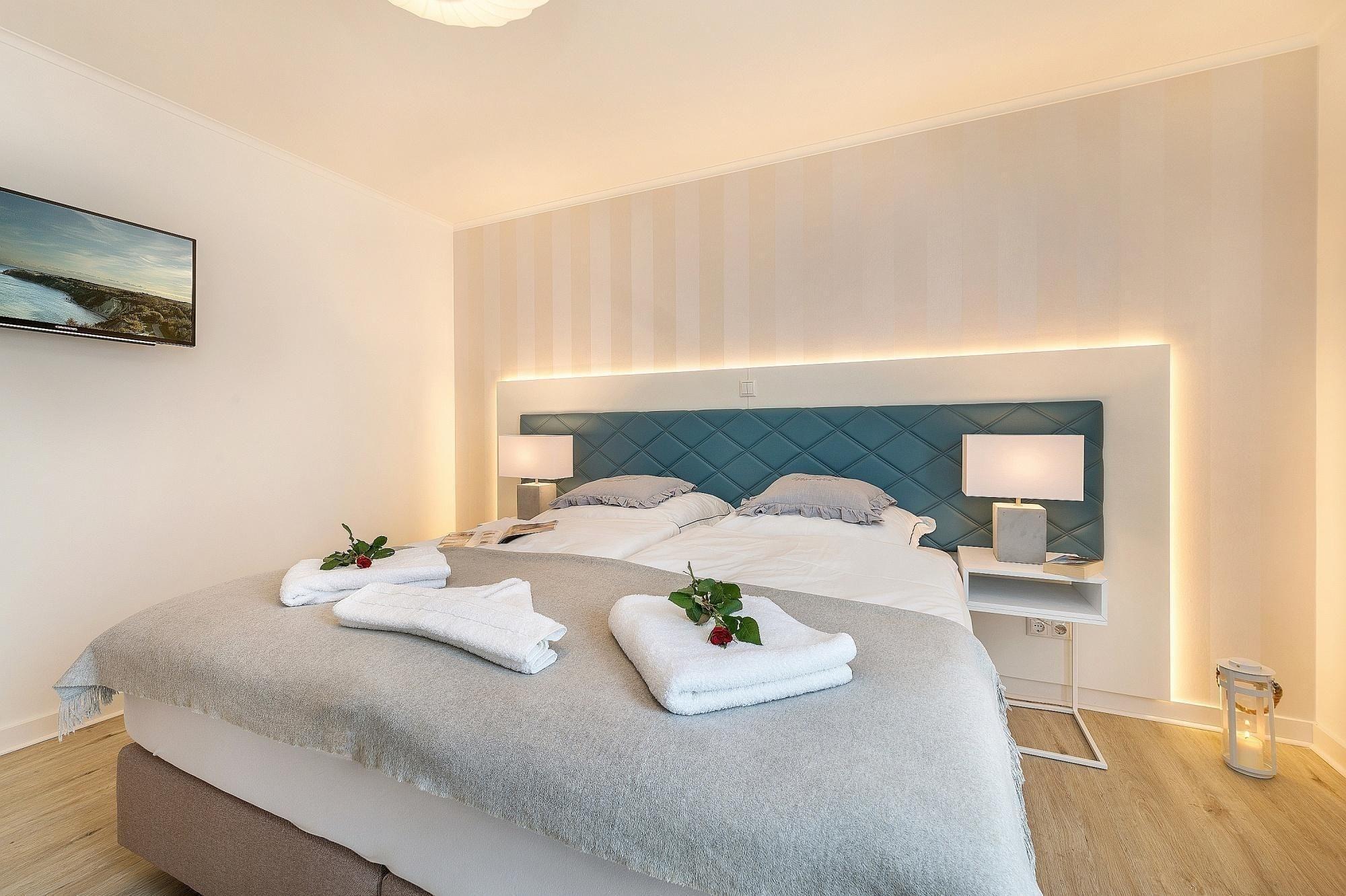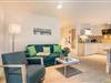 Die Ferienwohnung bietet einen hohen Wohnkomfort mit zwei Schlafzimmern, in denen sich jeweils ein Doppelbett befindet. Der offene Wohnbereich ist mit einem gemütlichen Sofa und Sessel ausgestattet und lädt zum Entspannen ein. Eine moderne offene Küche erwartet die Gäste mit hochwertigen Geräten wie Geschirrspüler, Elektro-/Gasherd, Backofen, Mikrowelle und Kühlschrank. Die bodengleiche Dusche im Badezimmer ist barrierefrei und sorgt für zusätzlichen Komfort.