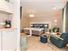 Der kombinierte Wohn- und Schlafbereich mit komfortablem Boxspring-Doppelbett lädt zu erholsamen Nächten und gemütlichen Abenden ein. In der kuscheligen Sitzecke genießen Sie gemeinsame Stunden – mit einem Buch, einem Glas Wein oder einfach nur mit Zeit füreinander.