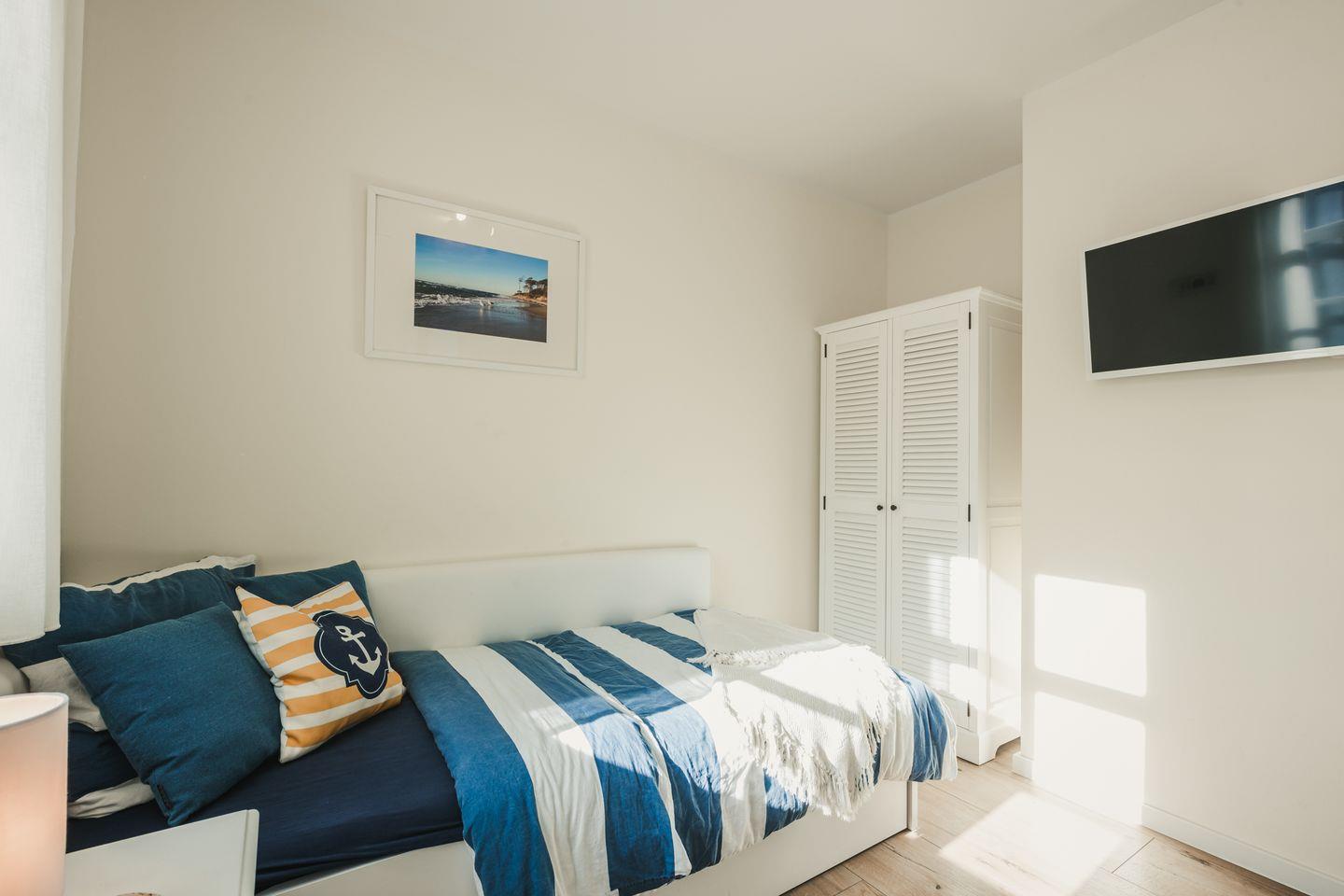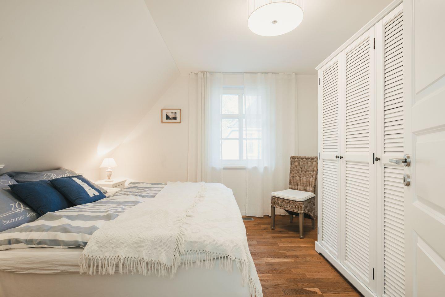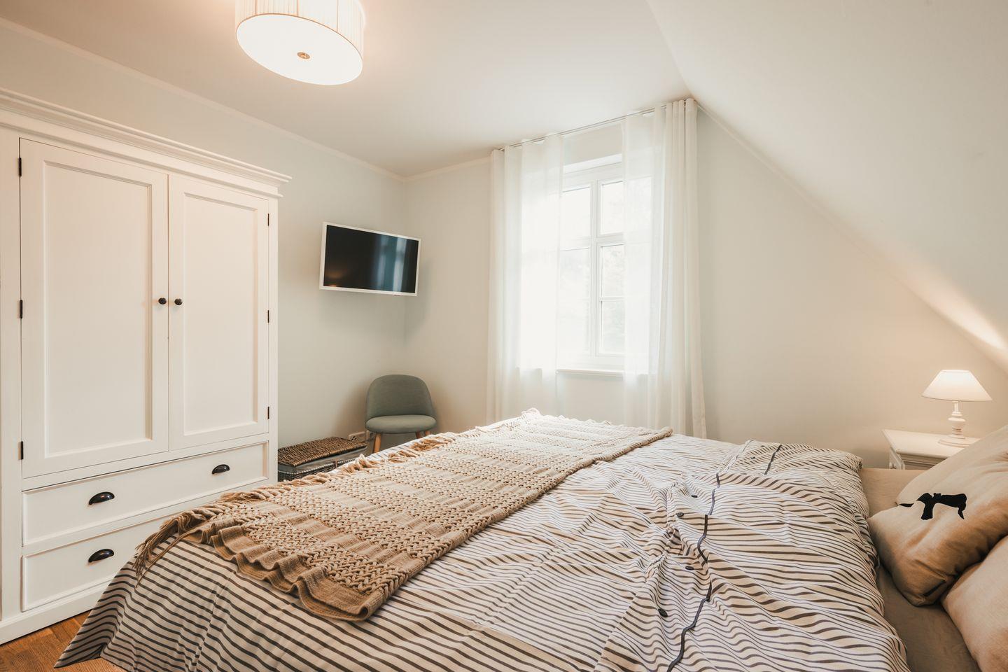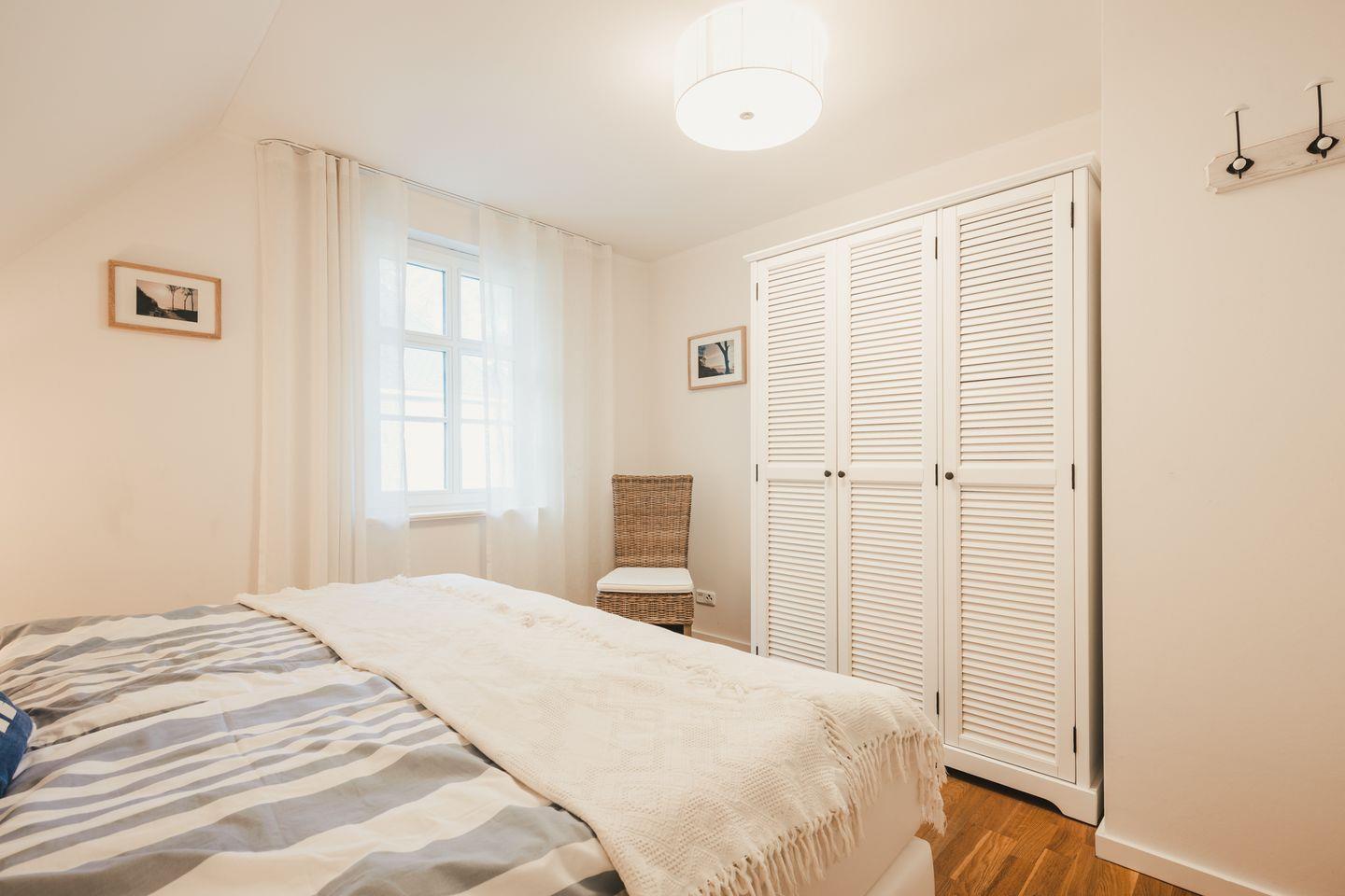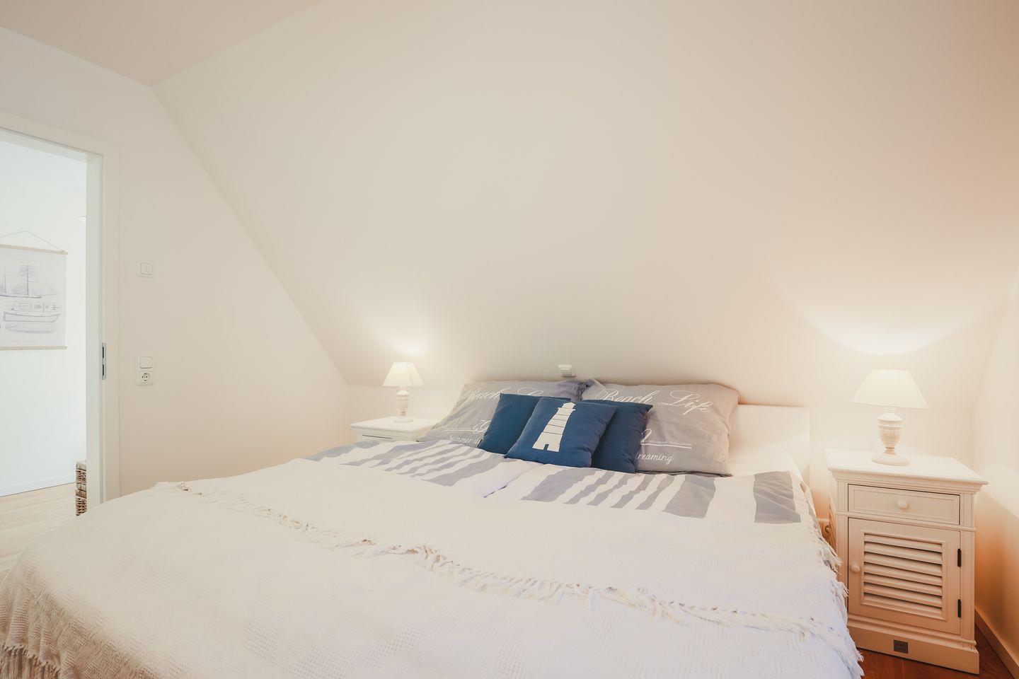 Im Erdgeschoss befindet sich ein zusätzliches Schlafzimmer für 1-2 Personen. Im Obergeschoss erwarten Sie zwei Schlafzimmer mit jeweils einem Doppelbett und ein Schlafzimmer mit einem Einzelbett und ausziehbarem Bettkasten, welches für Kinder bis max. 14 Jahre geeignet ist. Diese Zimmer haben eine Verdunklungsmöglichkeit und sind mit Insektenschutz ausgestattet.