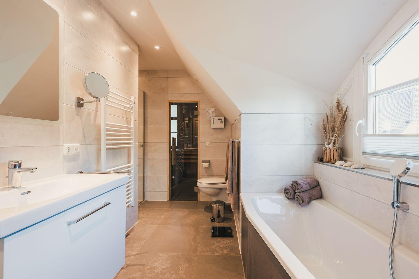 Die hochwertig ausgestattete und zum Wohnzimmer hin offene Küche lässt keine Wünsche offen. Ein großer Esstisch und eine gemütliche Couch komplettieren den Wohnkomfort. Das Haus verfügt im Erd- und Obergeschoss über ein Badezimmer. Eines mit einer geräumigen Dusche und das andere mit Dusche, Badewanne und angrenzender Sauna.
