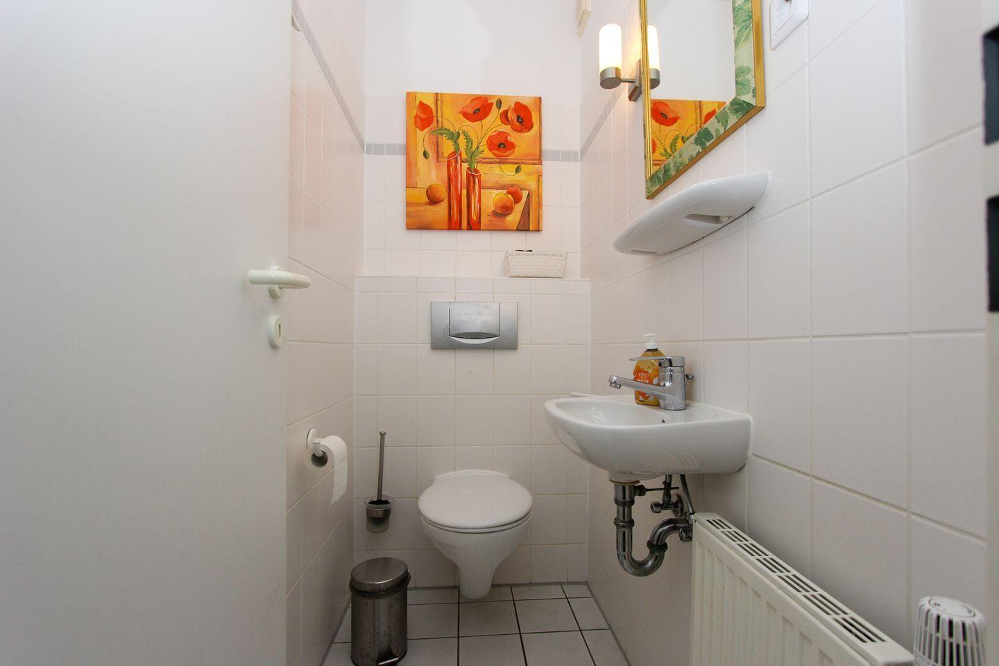 Im hinteren Teil der Wohnung befindet sich rechts das großzügige Schlafzimmer, mit gemütlichem Doppelbett, einem Kleiderschrank, einer Kommode, sowie einem Stuhl. Auf der gegenüberliegenden Seite befinden sich ein Duschbad mit WC und ein separates Gäste-WC. Am Ende des Flures ist ein Abstellraum.