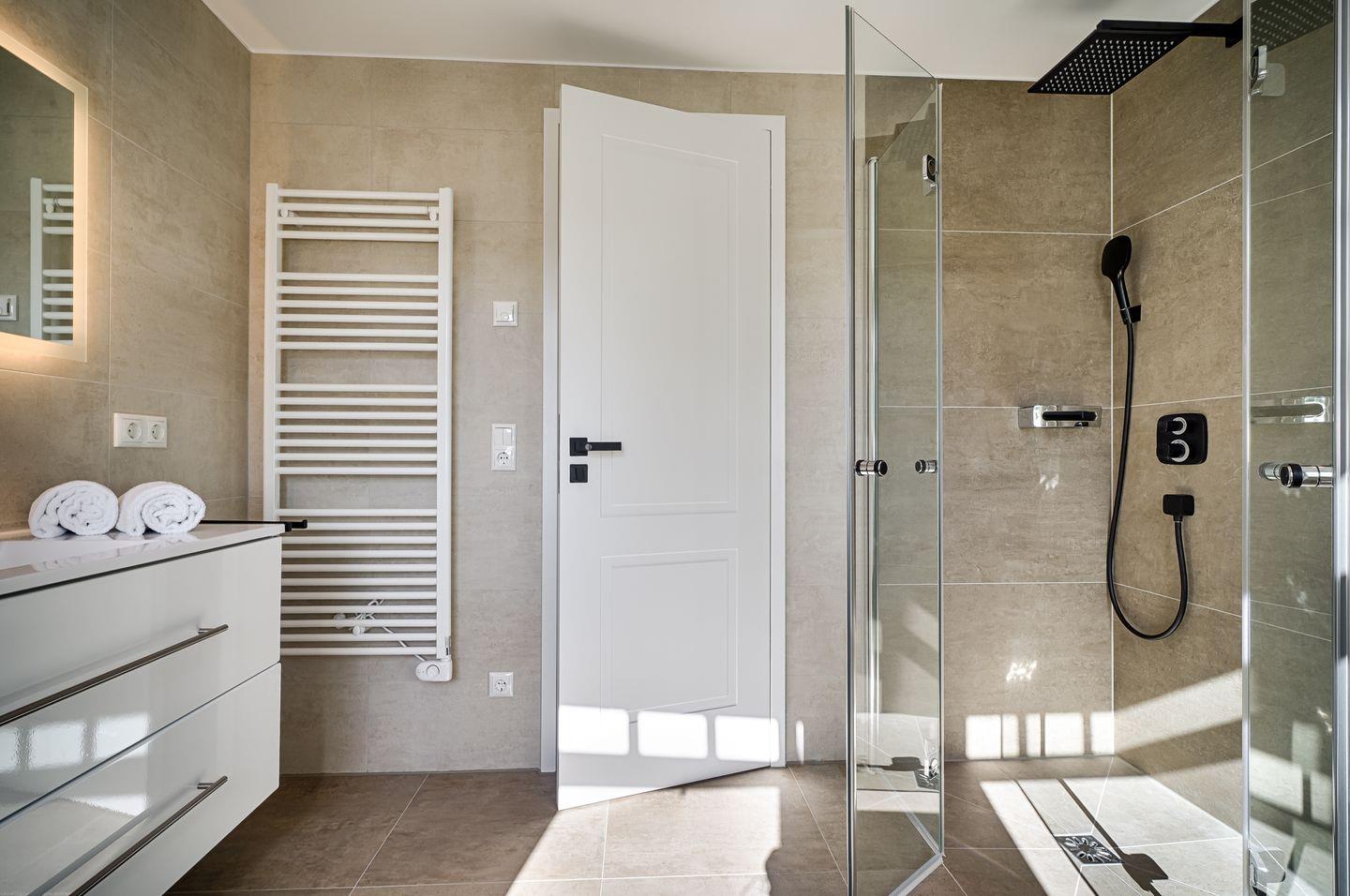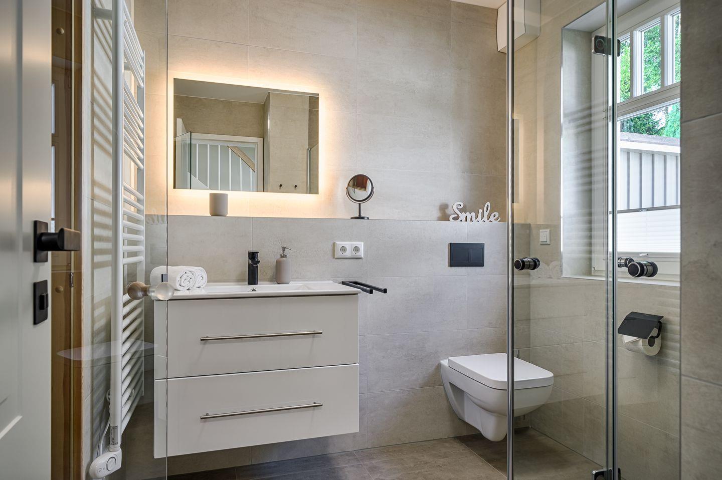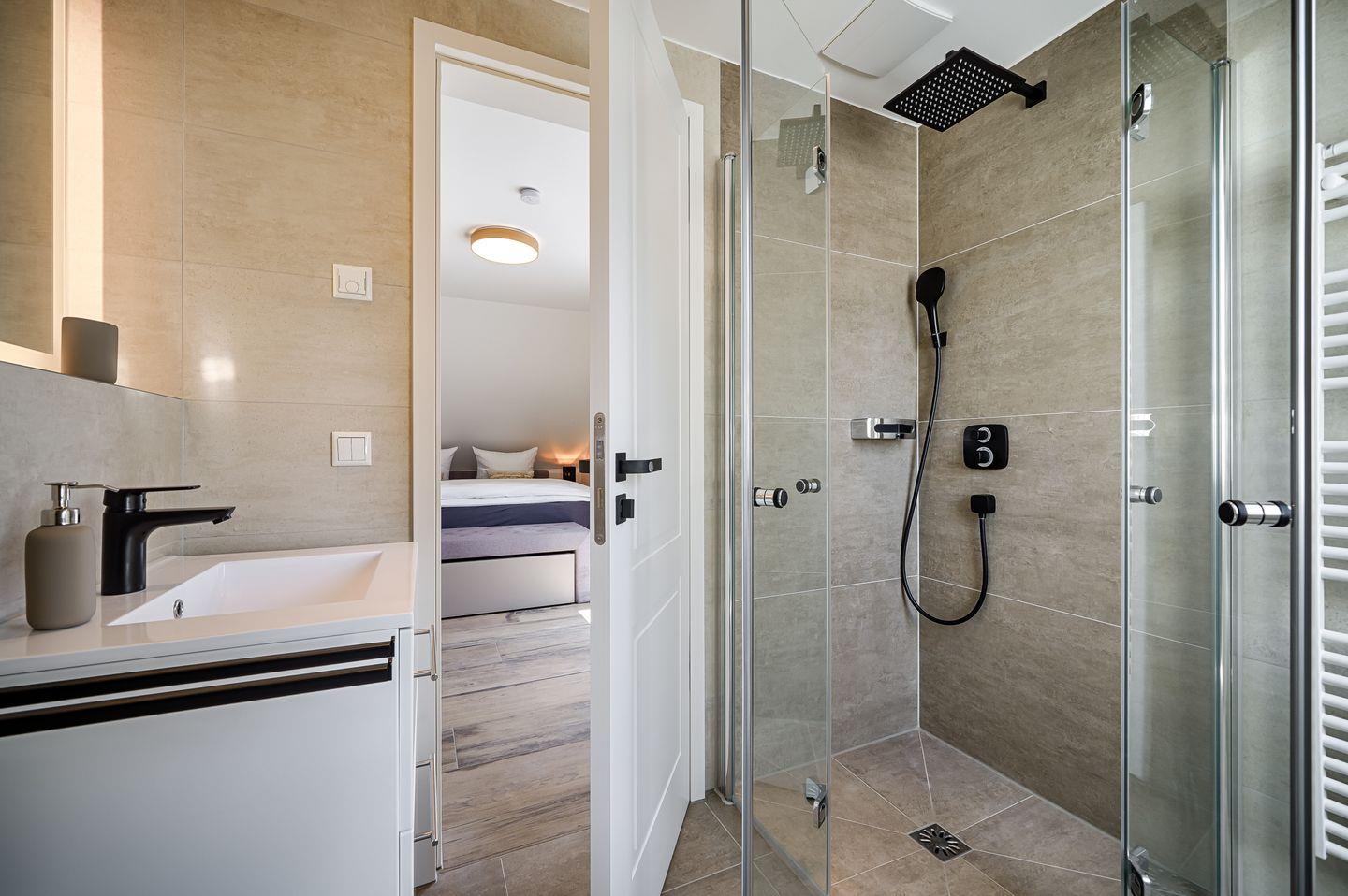 1 Schlafzimmer mit Boxspringbett (1,80x2,00m), TV, eigenes Bad (Tageslicht) mit Dusche, Zugang zur Dachterrasse