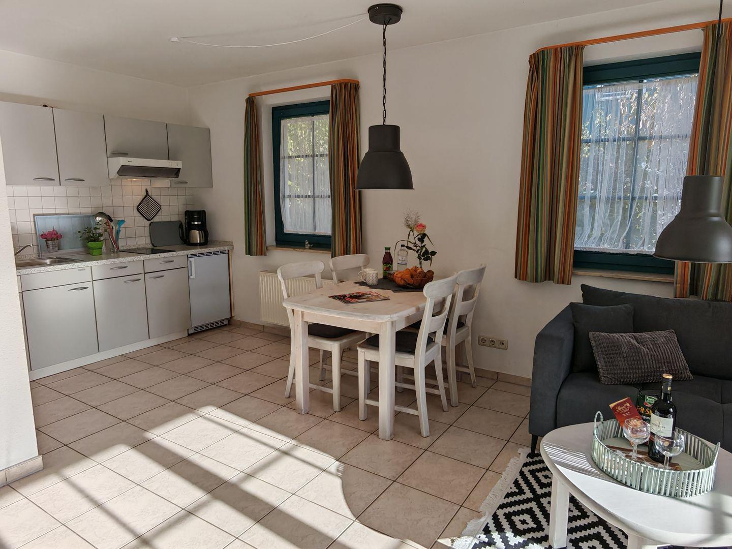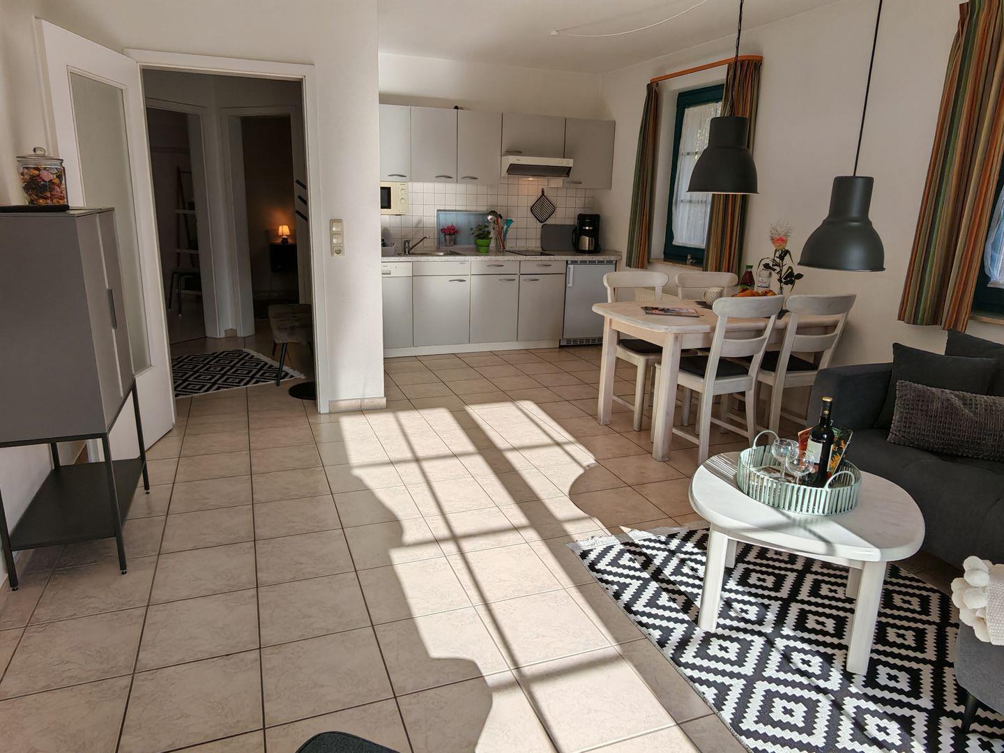Herzlich willkommen in der Ferienanlage Capitän Christoph in unserer stilvollen Ferienwohnung (ehemals "Börge")! Mit großzügigen 52 Quadratmetern bietet diese Ferienwohnung den idealen Rückzugsort für Ihren Traumurlaub. Die offene Küche im Wohnzimmer ist mit allen notwendigen Geräten ausgestattet und lädt zum gemeinsamen Kochen und Genießen ein. Entspannen Sie auf dem gemütlichen Sofa oder dem bequemen Sessel.