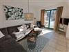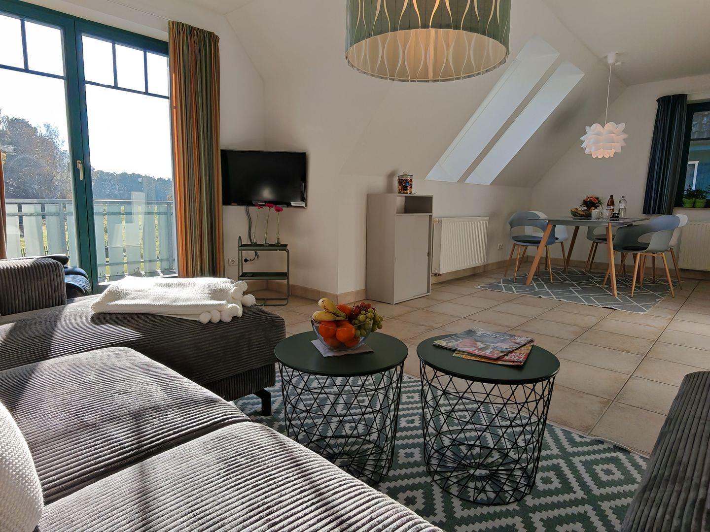 Der Wohnbereich lädt zum Verweilen ein. Ein komfortables Sofa und ein Sessel bieten gemütliche Plätze, um sich zu entspannen. Der Flachbild-TV sorgt für Unterhaltung und ist ideal, um gemeinsam einen Filmabend zu verbringen.