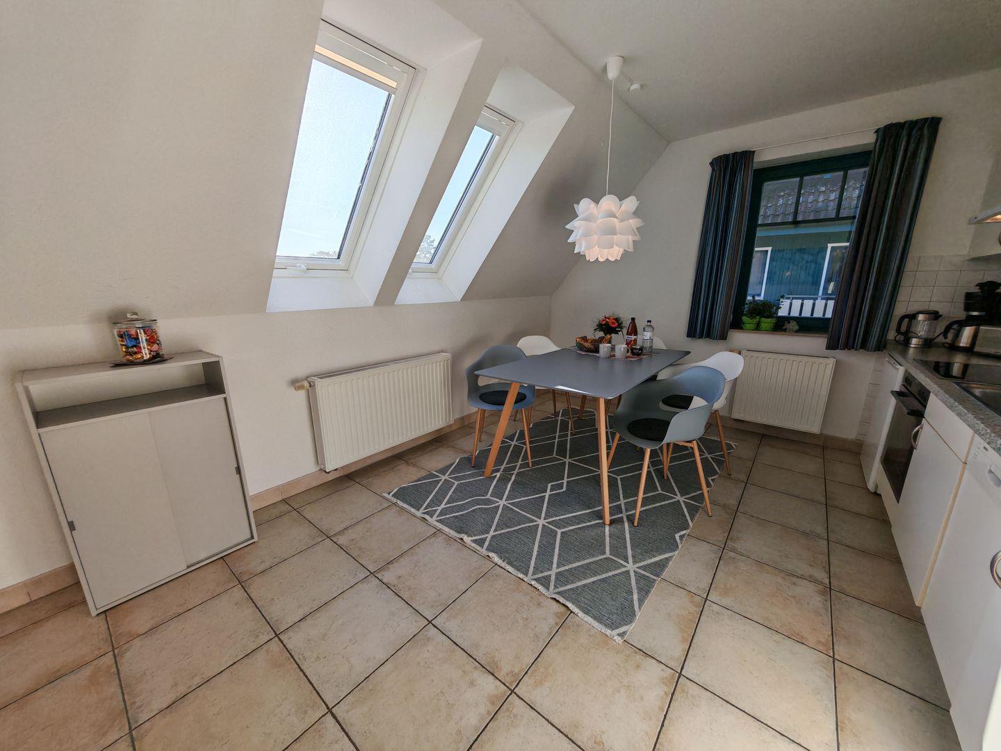 Die offene Küche ist modern und komplett ausgestattet, um Ihren kulinarischen Vorlieben gerecht zu werden. Hier können Sie in entspannter Atmosphäre gemeinsam kochen und die Mahlzeiten an der schönen Essecke genießen.