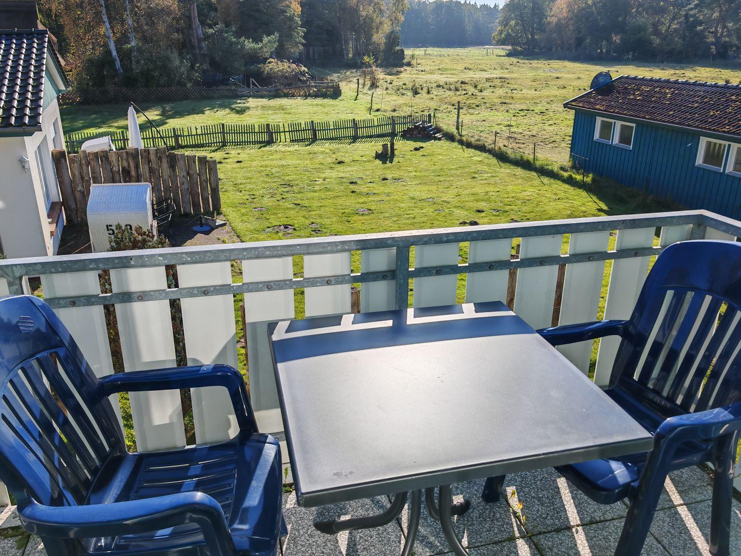 Der Südbalkon ist ein Highlight, der einen malerischen Blick auf eine grüne Wiese und den umliegenden Wald bietet. Hier können Sie die Natur in vollen Zügen genießen, sei es bei einem entspannten Frühstück in der Morgensonne oder einem abendlichen Glas Wein mit Blick auf den Sonnenuntergang.