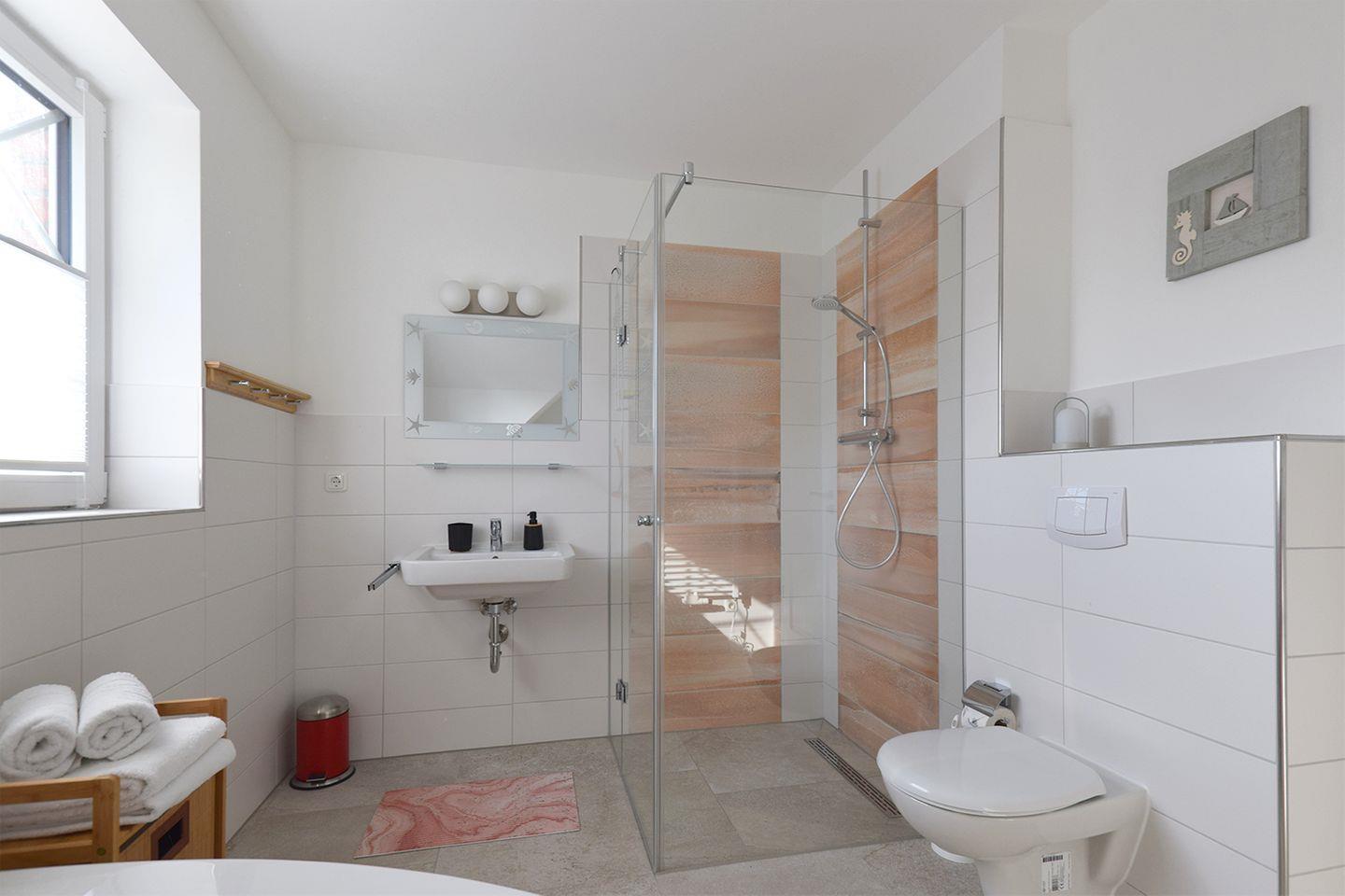 Das Haus verfügt über zwei Badezimmer. Das Bad im EG ist mit einer bodengleichen Dusche, WC, Waschbecken, Spiegel und Haartrockner ausgestattet. Für Erholung und Wellness steht eine eigene Sauna zur Verfügung. Das zweite Bad im 1. OG bietet eine Eckbadewanne und eine bodengleiche Dusche. Beide Badezimmer verfügen über warmes Wasser und sorgen mit Fenstern für angenehme Belüftung. Für weiteren Komfort sorgen außerdem eine eigene Waschmaschine sowie ein Wäscheständer.