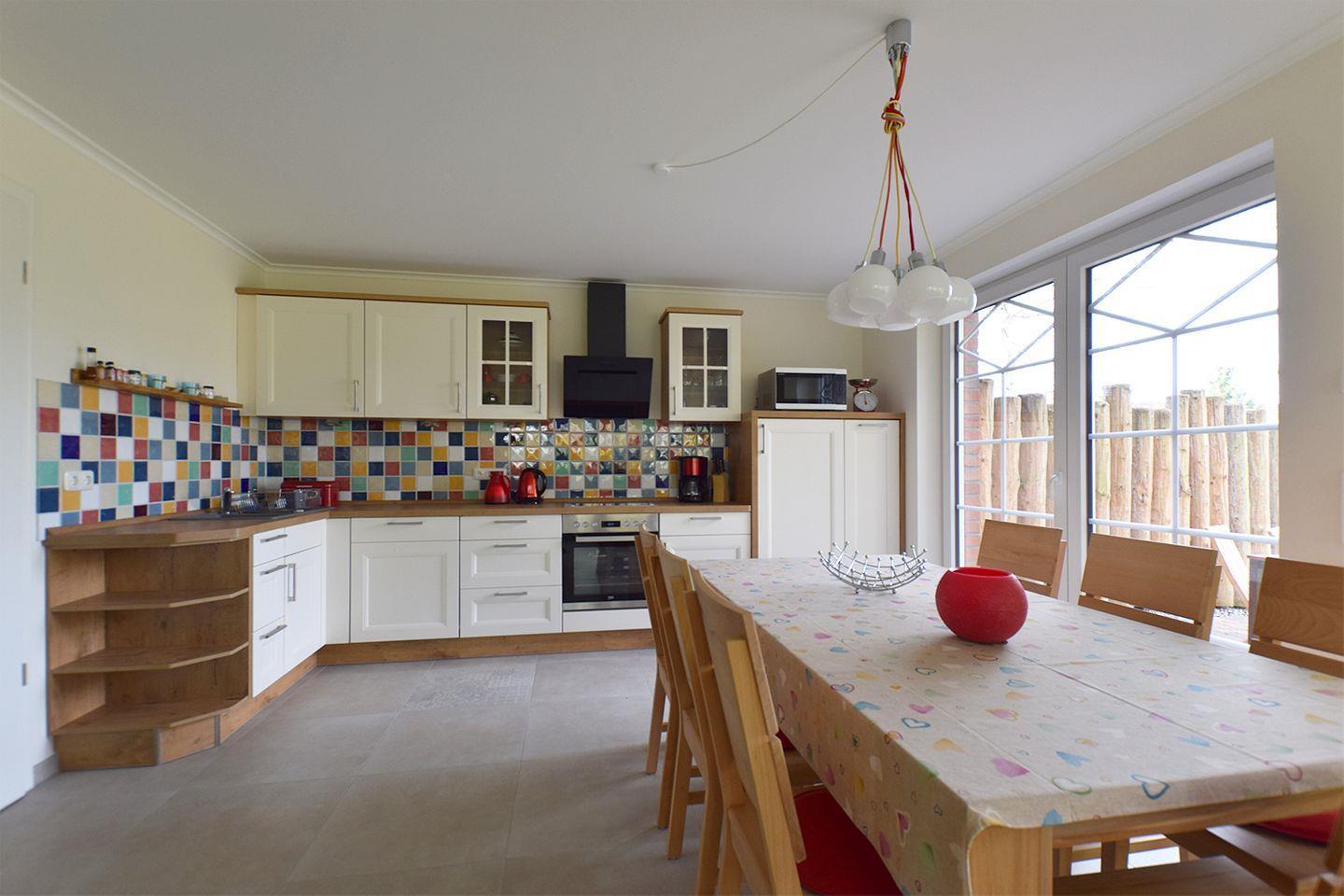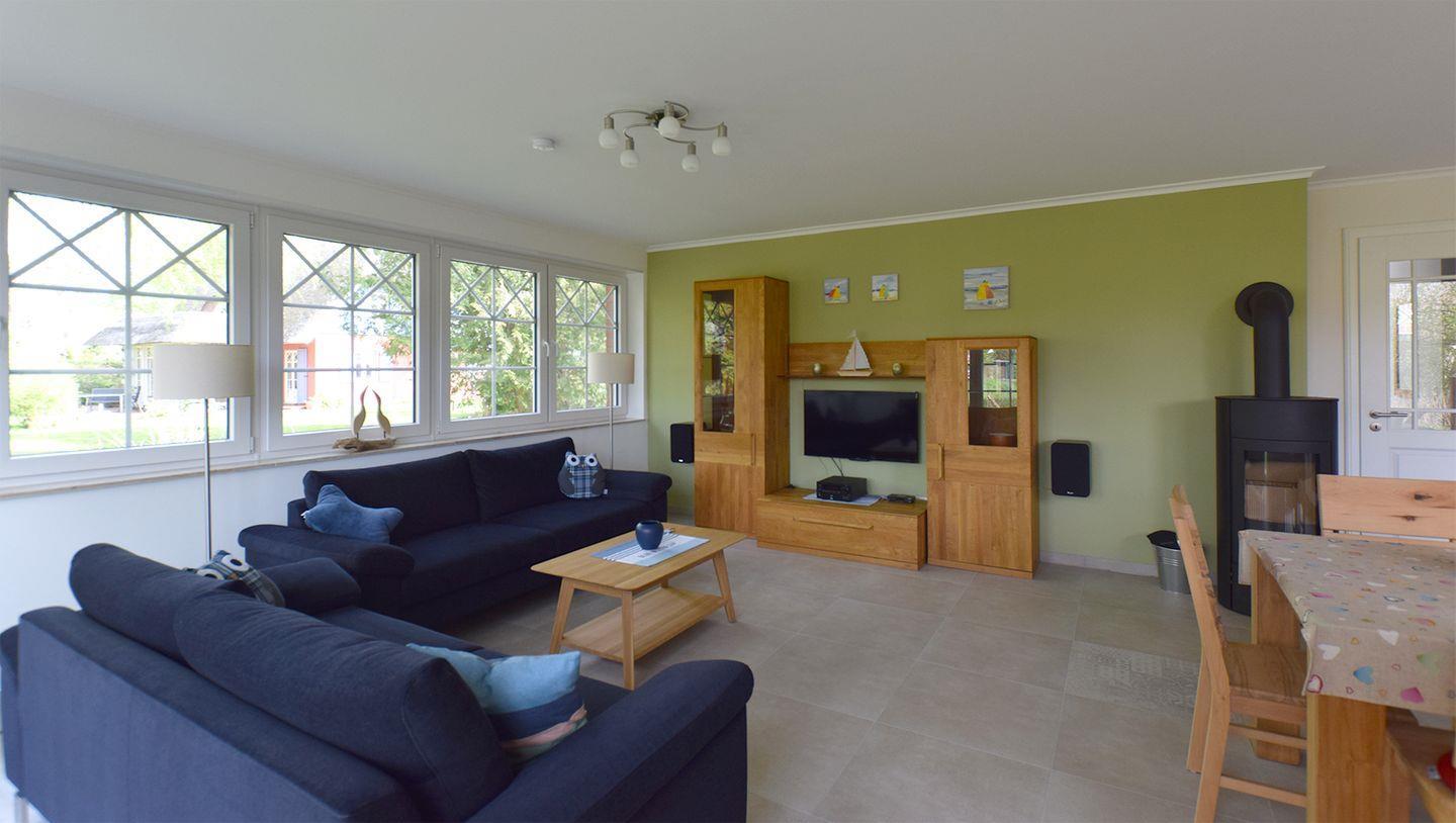 Das im Jahr 2025 fertig gestellte Haus bietet auf 110 m² Wohnfläche ausreichend Platz für bis zu sieben Personen und ist damit ideal für Familien oder Gruppen, die gemeinsam einen komfortablen Urlaub verbringen möchten. Die Unterkunft erstreckt sich über zwei Etagen, wobei sich die Hauptebene auf dem Parterre befindet. Insgesamt verfügt das Haus über fünf Zimmer, darunter vier Schlafzimmer mit Laminatboden. Das Wohnzimmer hingegen ist mit Fliesenboden ausgestattet und lädt durch eine gemütliche Sofaecke sowie einen Kaminofen zu entspannten Stunden ein. Durch die Fußbodenheizung im gesamten Haus ist für eine angenehme Wärme gesorgt.