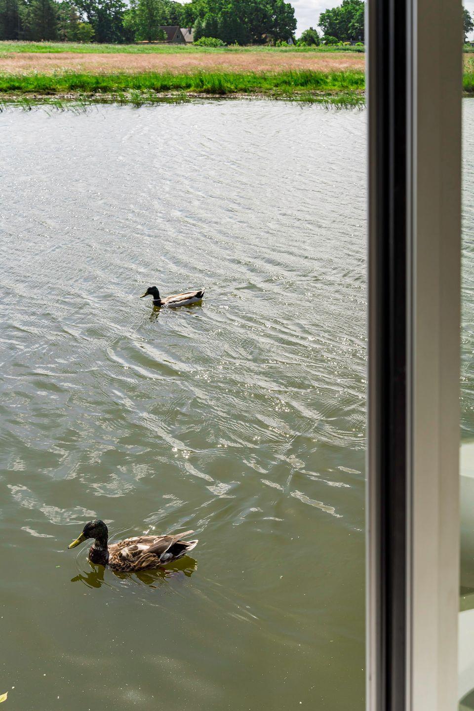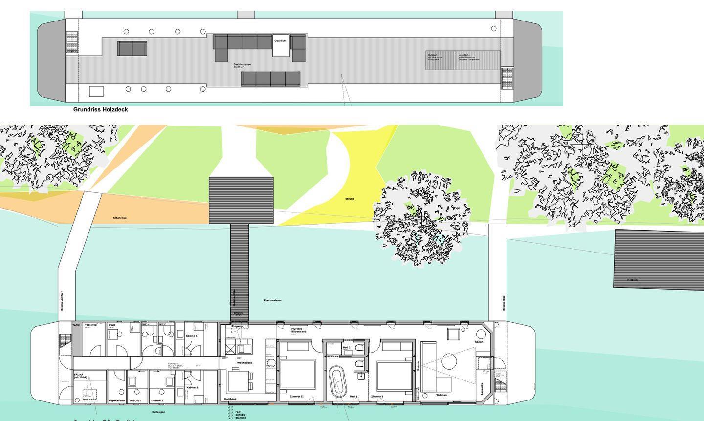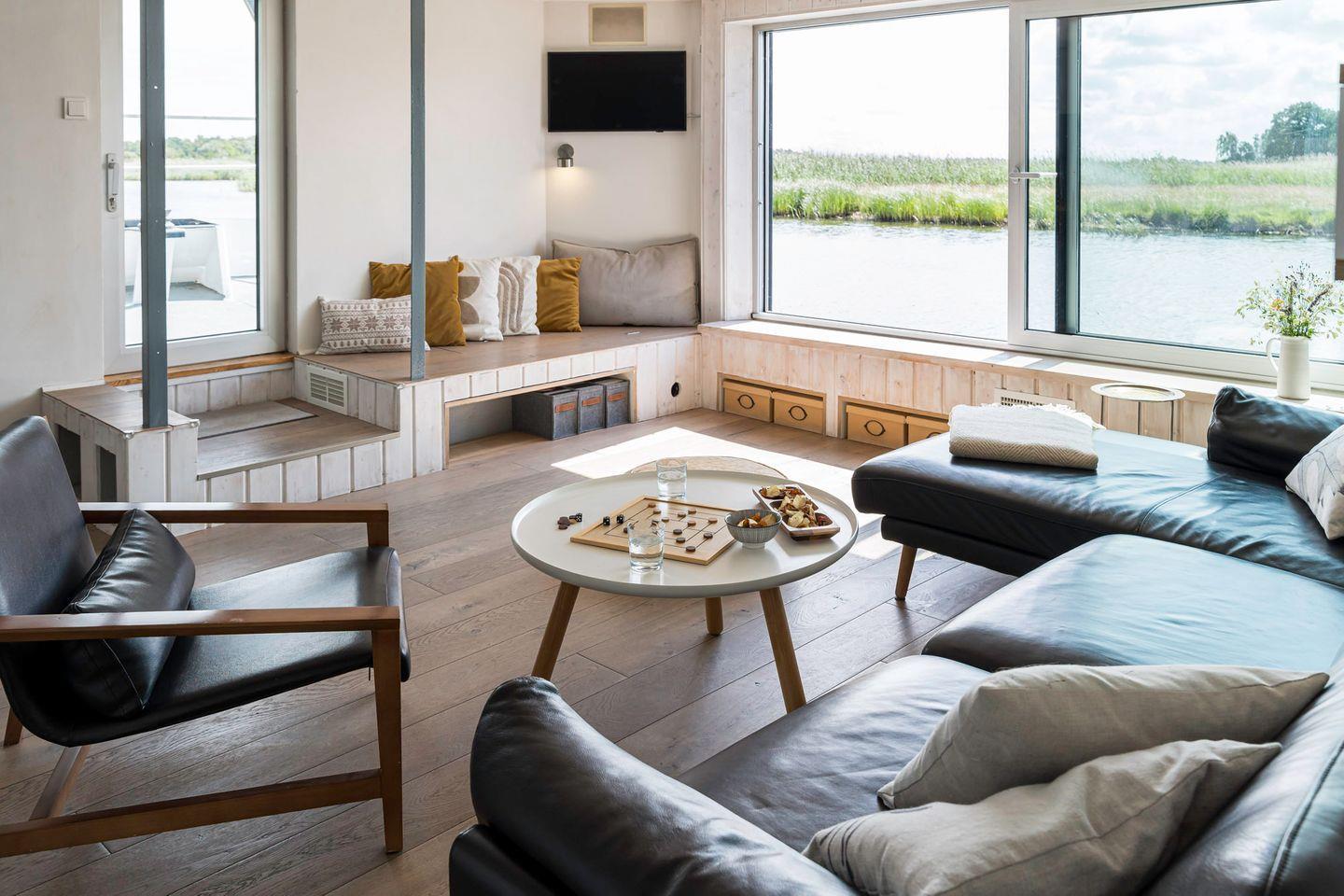 Ein besonderes Highlight ist das große Sonnendeck auf dem Dach des Schiffes, von dem aus Sie einen unverbauten Blick auf die Landschaft des Nationalparks genießen können. Hier lassen sich traumhafte Sonnenuntergänge erleben – ein unvergesslicher Moment unter freiem Himmel. Auch das 2.500 Quadratmeter große Wassergrundstück steht Ihnen zur Alleinnutzung zur Verfügung. Es bietet eine weitläufige Spiel- und Sonnenwiese sowie verschiedene gemütliche Sitzecken, die zum Verweilen einladen.