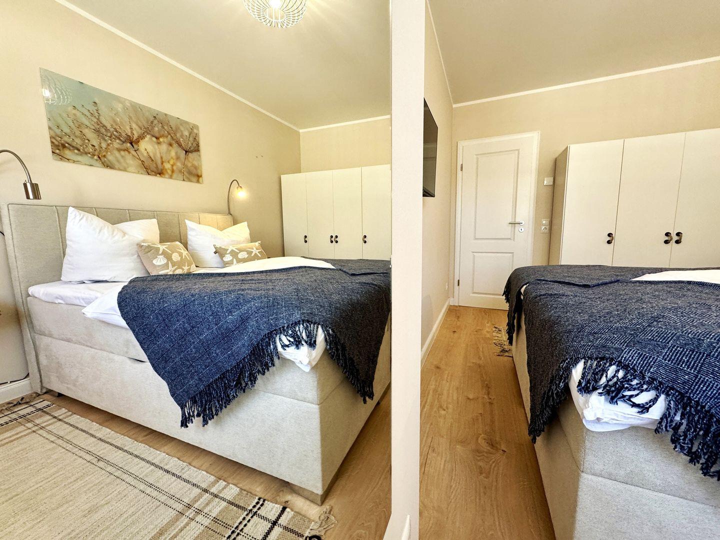 Das Schlafzimmer verspricht mit seinem modernen Boxspringbett erholsame Nächte und ruhige Morgen. Das moderne Badezimmer mit bodengleicher Dusche und Waschmaschine rundet den Komfort ab und macht auch längere Aufenthalte besonders angenehm.