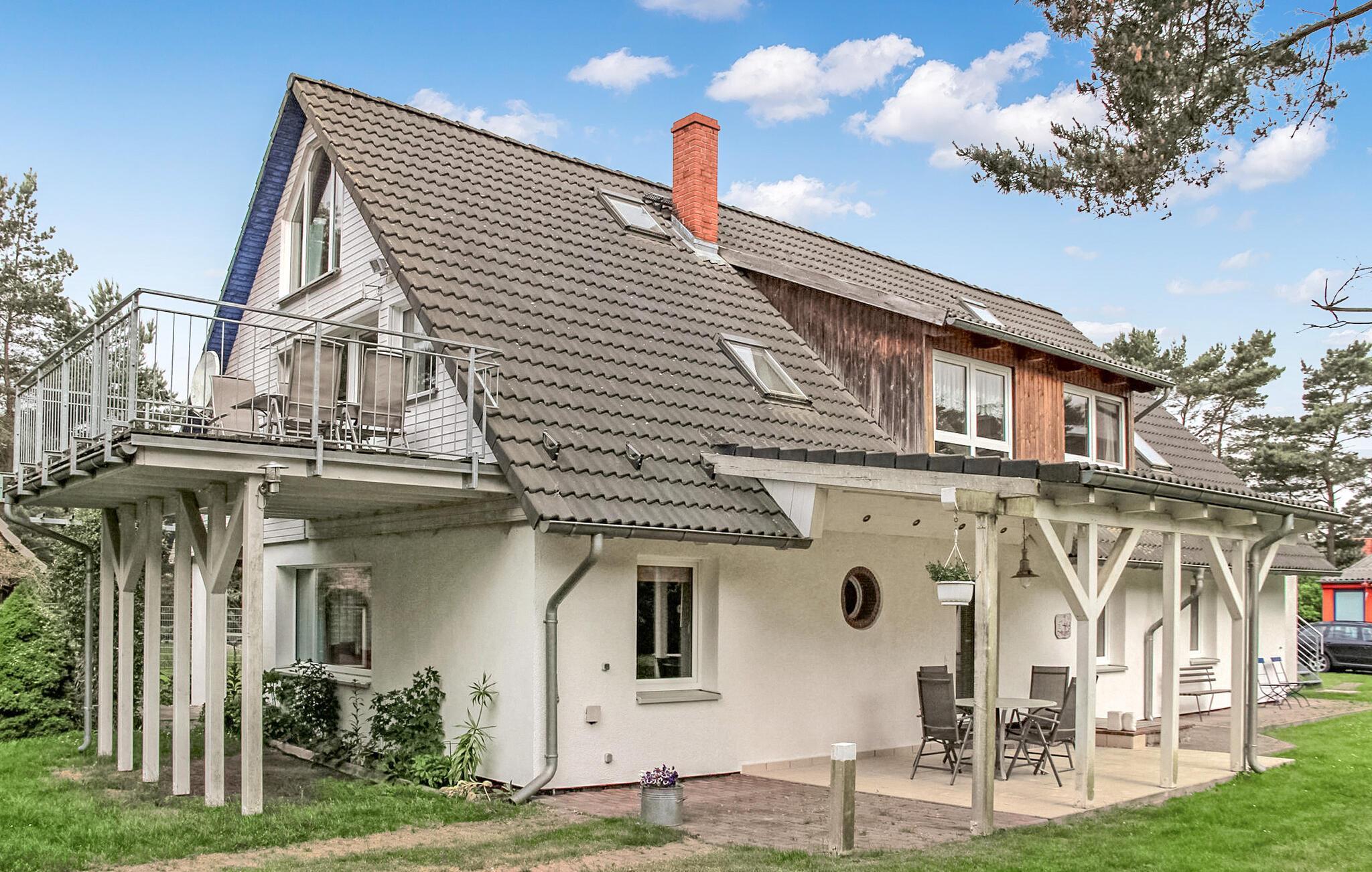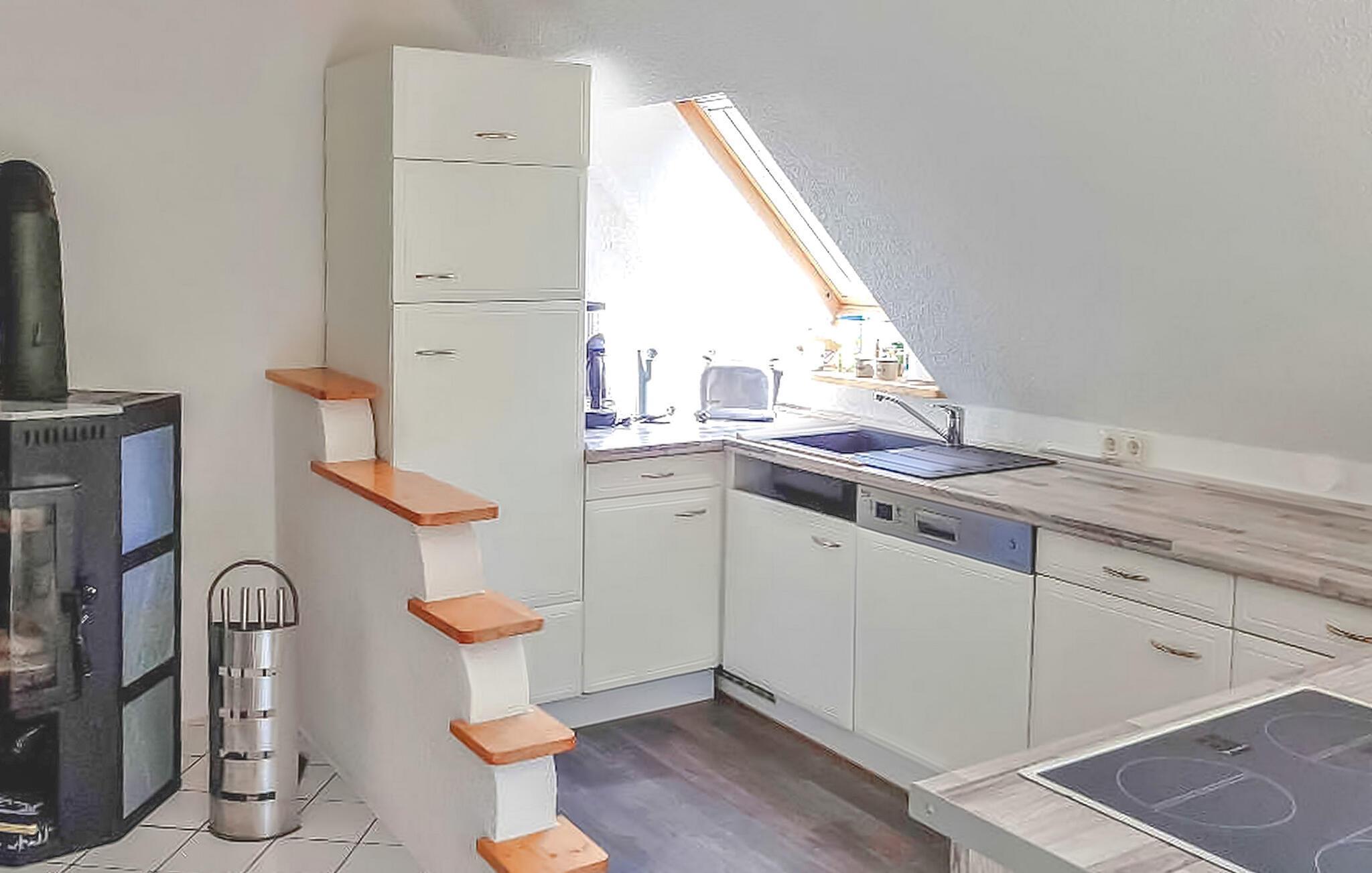 Die Fewo erstreckt sich über 3 Ebenen. Zugang über Diele im EG. Im Obergeschoss befindet sich ein großer, offener Wohnbereich (SAT-TV, Radio, Esstisch, Kaminofen), eine offene Küchenzeile (E-Herd mit Backofen, Kühlschrank mit Tiefkühlteil, Mikrowelle, Spülmaschine, div. Küchengeräte), ein Schlafraum (zwei Einzelbetten) sowie DU/WC. Im Dachgeschoss (steile Treppe) befinden sich ein Schlafraum (1x Doppelbett) und ein weiteres Bad mit DU/WC. Die Fewo verfügt über einen möblierten Balkon.