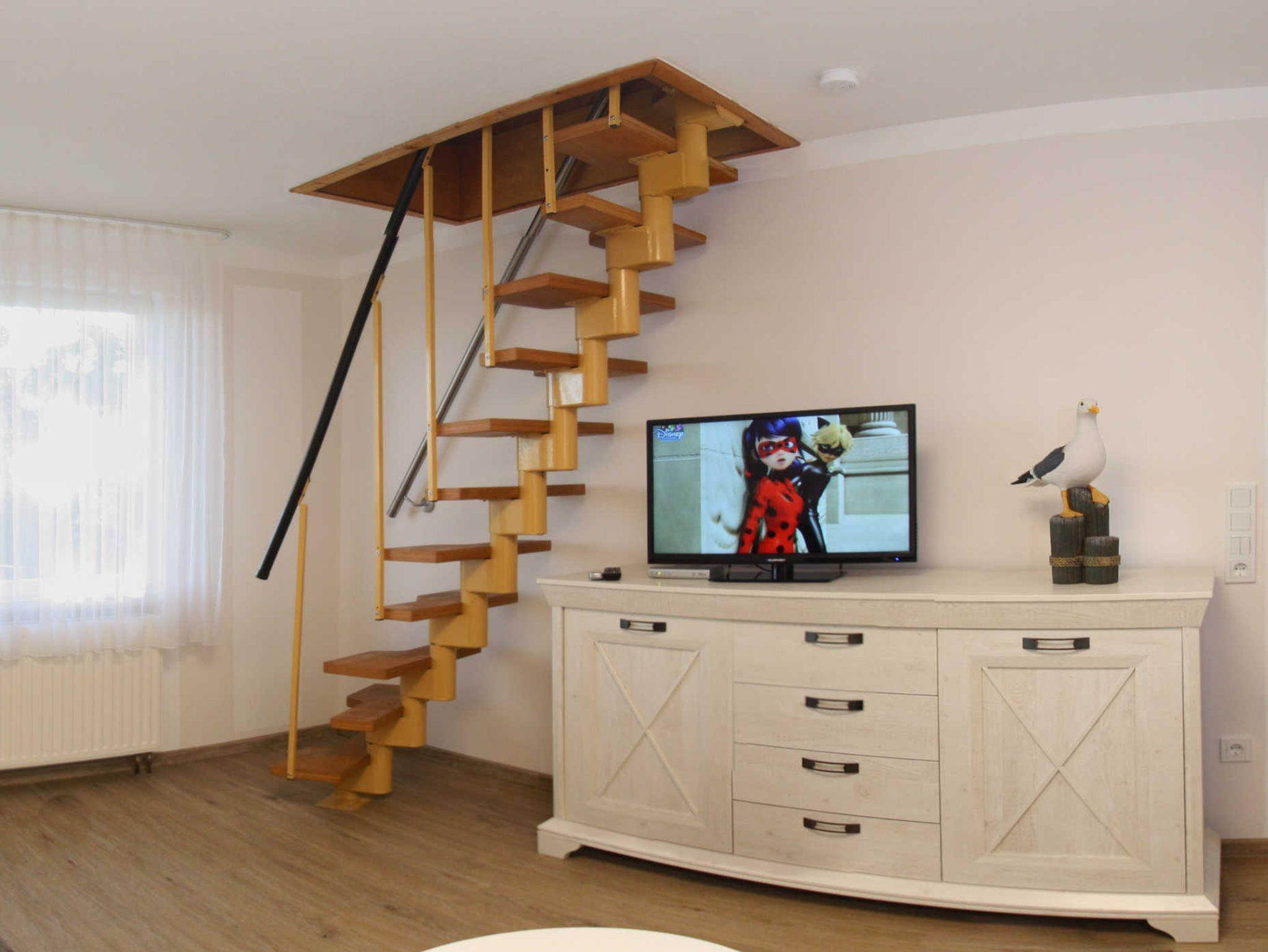 Zu den Schlafzimmern gelangt man über eine viertel gewendelte Spartreppe.