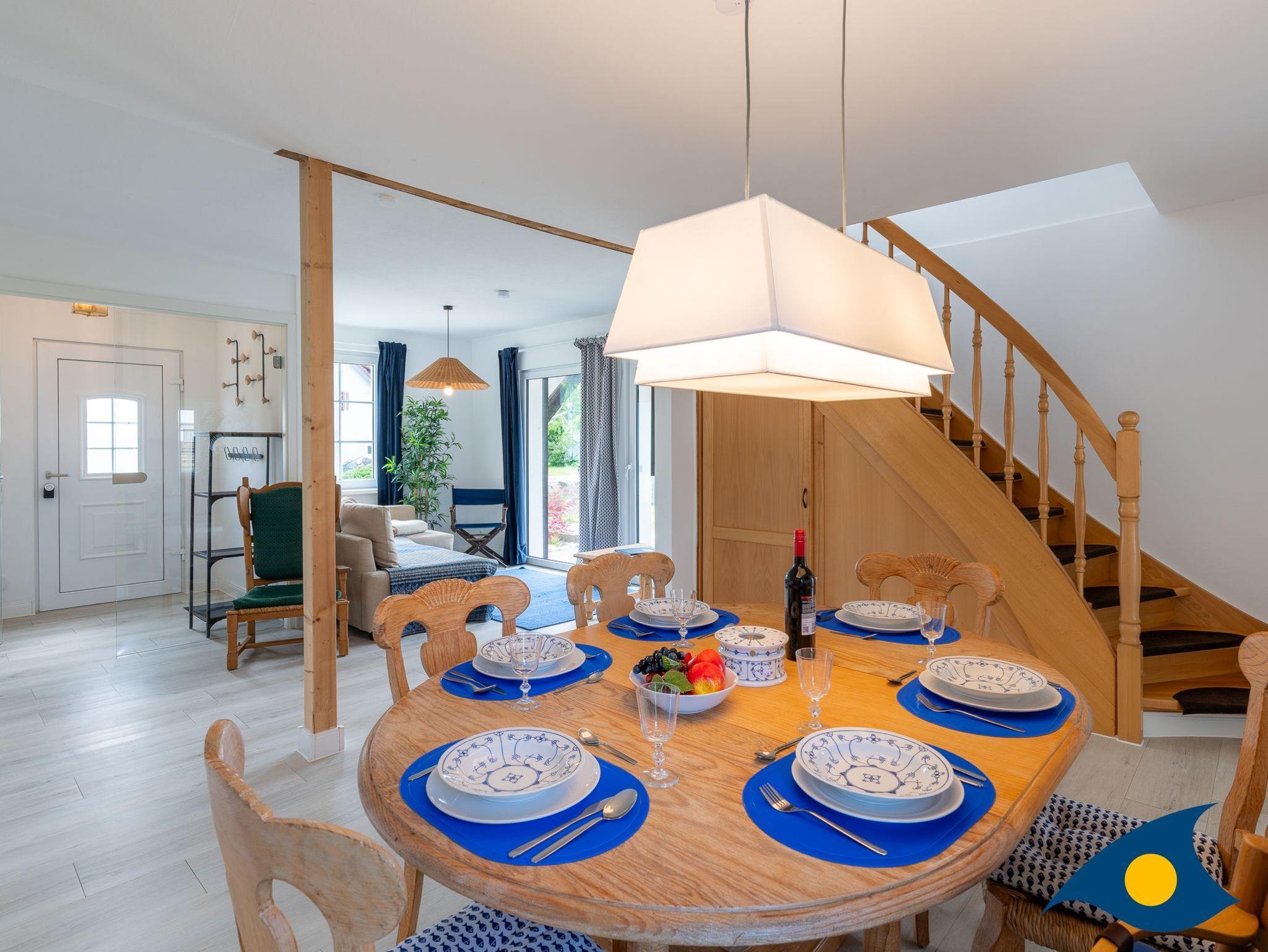 Der großzügige Wohn- und Essbereich bietet ausreichend Platz für bis zu 6 Personen. Hier finden Sie neben einem großen Esstisch für gemeinsame Mahlzeiten, auch eine gemütliche Couchecke mit einem großen Smart-TV. Zur Unterhaltung steht neben dem normalen TV-Programm auch Magenta TV mit Abo´s für Netflix, Disney+ und RTL+ zur Verfügung, sodass auch regnerische Tage zum Genuss werden.
