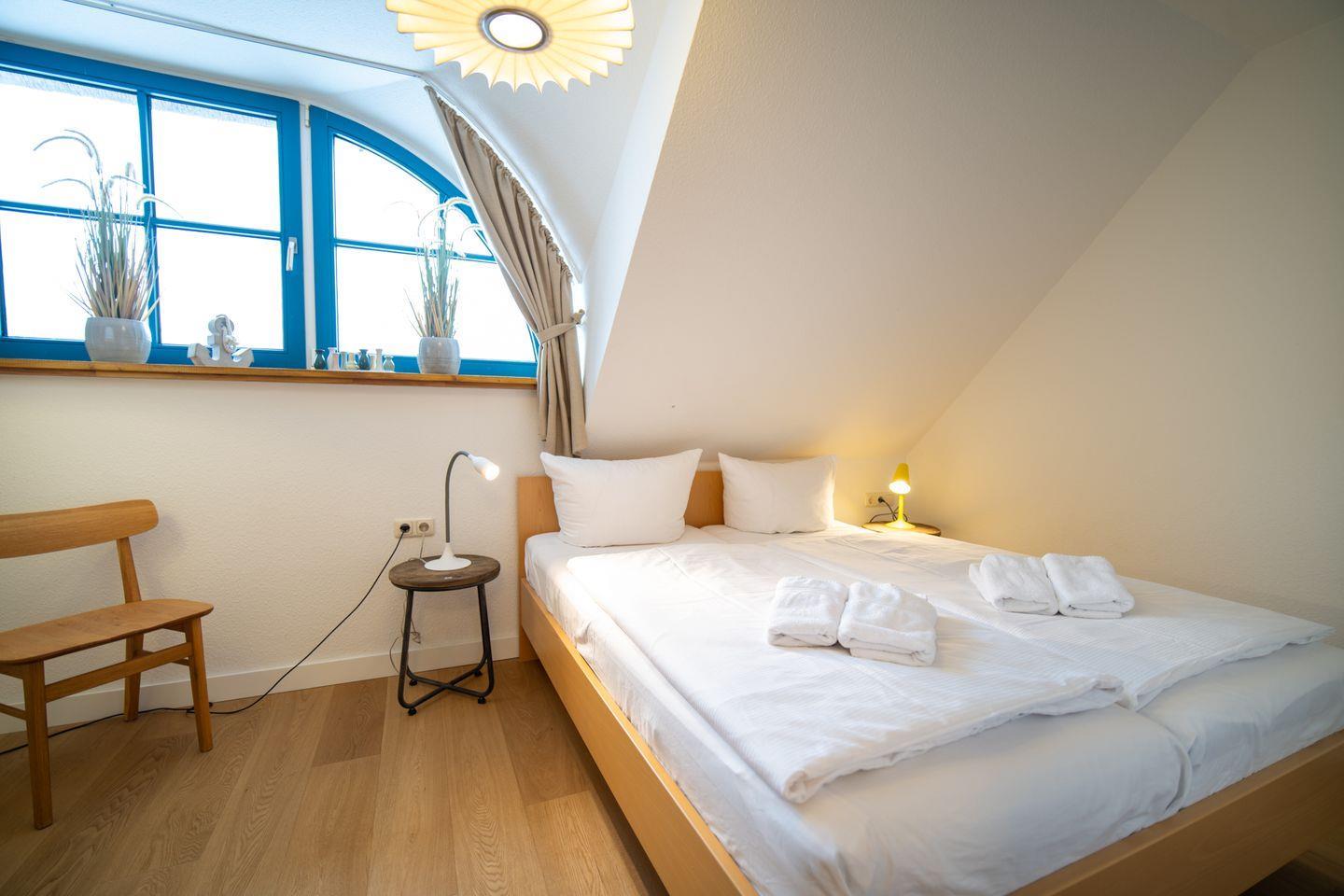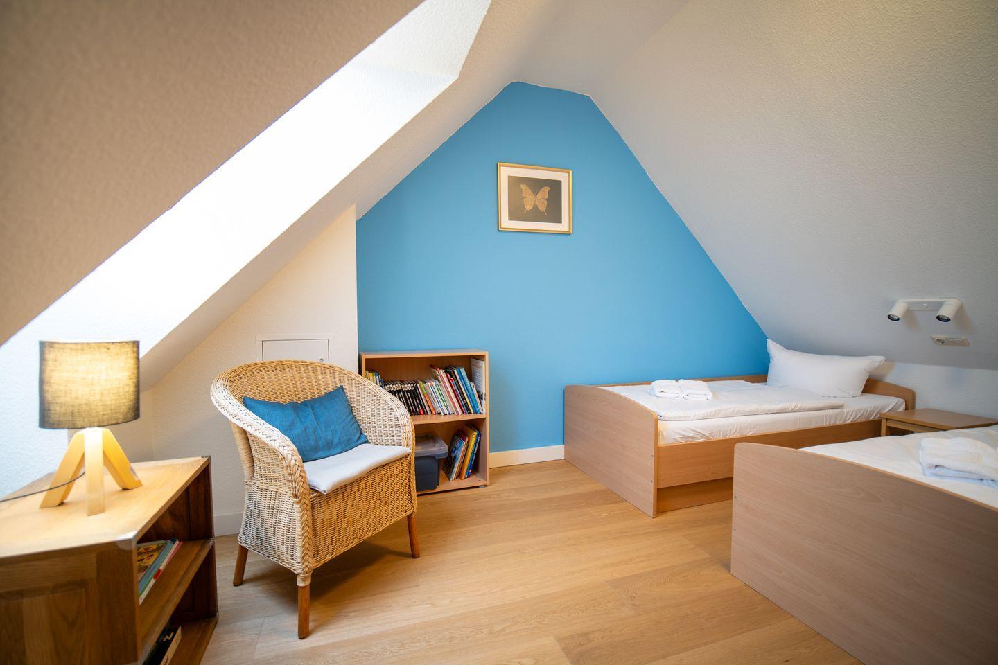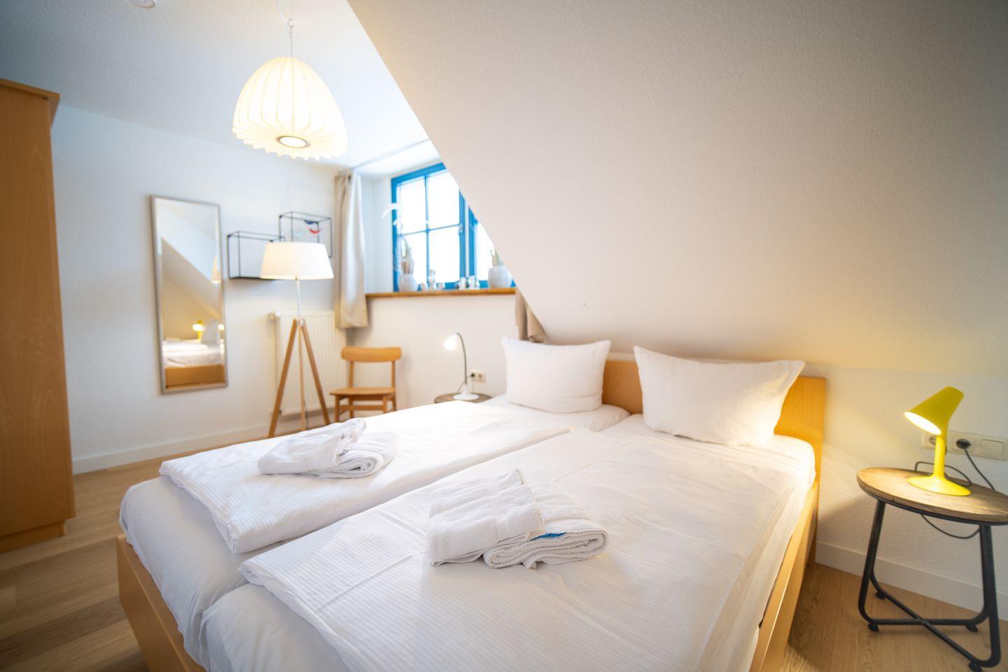 Im Obergeschoss befinden sich zwei geräumige Schlafzimmer mit Doppelbetten sowie ein innenliegendes Bad mit Badewanne – ideal für gemütliche Abendrituale. Das Dachgeschoss beherbergt ein charmantes Kinderzimmer mit zwei Einzelbetten – ein wunderbarer Rückzugsort für die kleinen Gäste.