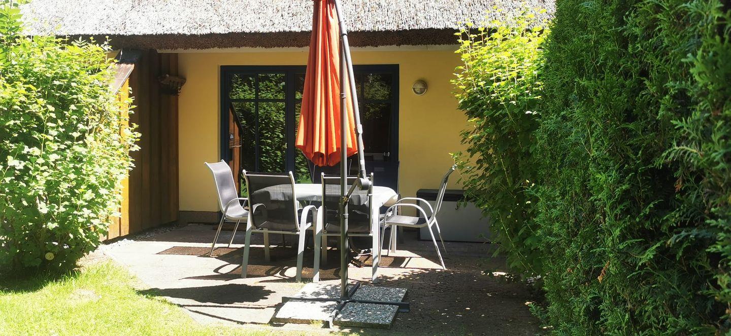Ferienhaus Holunder 2 bietet ländliche Gemütlichkeit mit Reetdach, Kamin und Terrasse in Puddeminer Wiek.