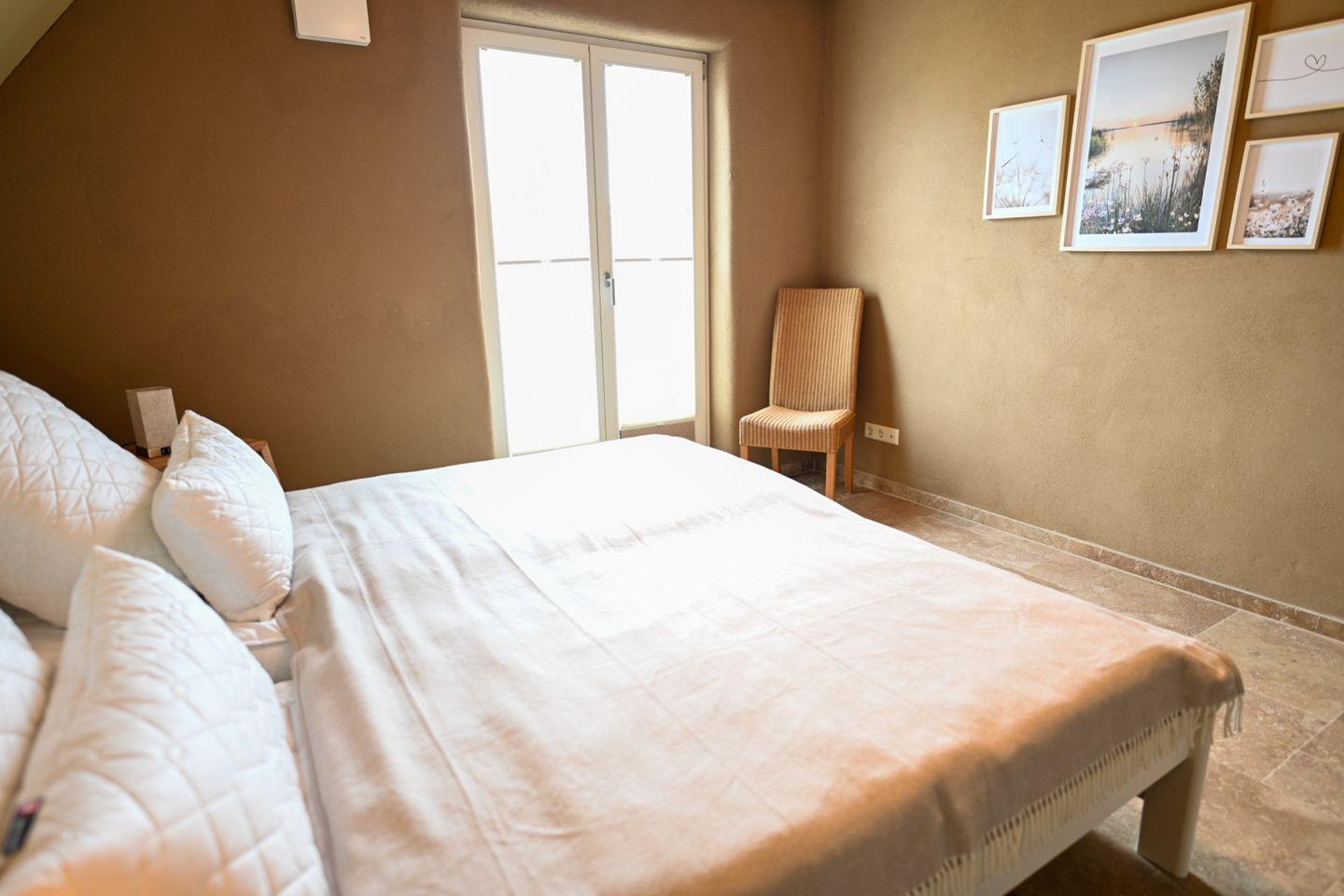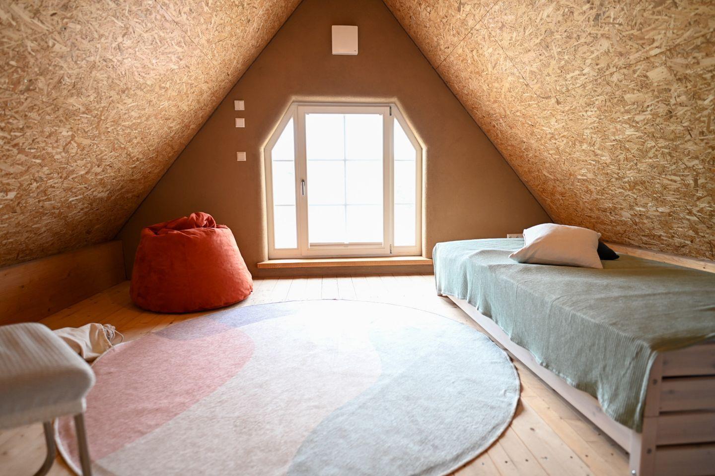 Im Obergeschoss befinden sich drei weitere Schlafzimmer – zwei mit Doppelbett und eines mit zusammenstellbaren Einzelbetten – sowie ein komfortables Vollbad. Ein besonderes Highlight ist der ausgebaute Dachgiebel mit herrlichem Ausblick: ideal als Rückzugsort zum Lesen, Arbeiten oder Spielen.