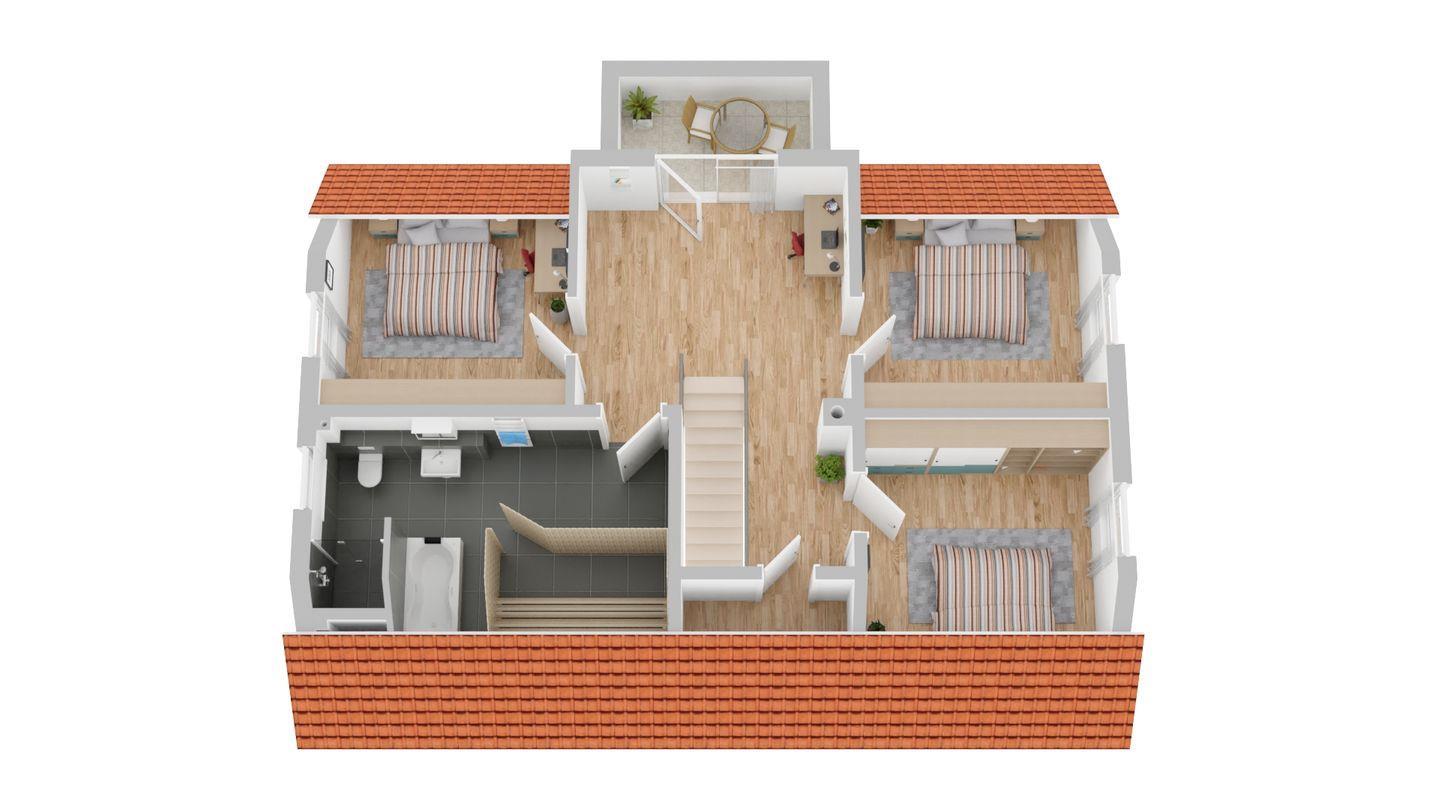 Im Erdgeschoss befinden sich ein Schlafzimmer, ein modernes Duschbad sowie ein Hauswirtschaftsraum mit Waschmaschine und Trockner. Drei weitere Schlafzimmer erwarten Sie im Obergeschoss, wo sich auch das großzügige Wellnessbad mit Badewanne, Regendusche und Infrarotsauna befindet. Auf der hellen Galerie mit Balkon genießen Sie den weiten Blick über die Puddeminer Landschaft – oder nutzen den Platz als stilvolles Homeoffice.