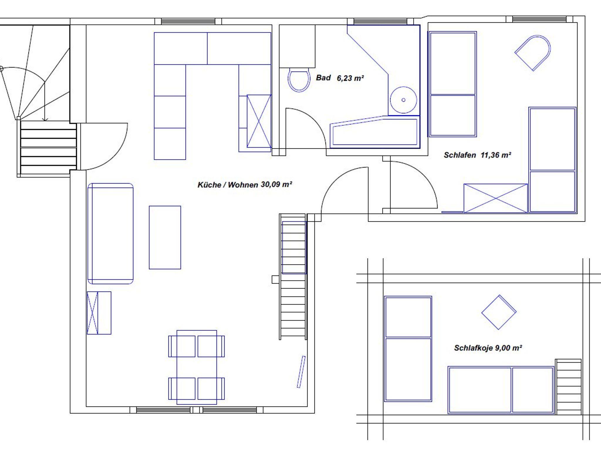 Ferienwohnung Lippert (60qm) für 2 Erwachsene und 2 Kinder mit 1 Schlafzimmer, 1 offene Schlafkoje, Terrasse im Garten