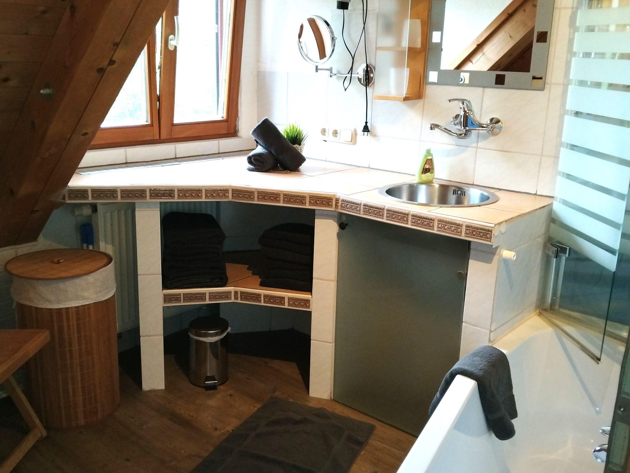 Die komfortable Ferienwohnung ist 60qm groß und für 2 Erwachsene und 2 Kinder ausgelegt. Im Schlafzimmer stehen zwei bequeme Einzelbetten. In der offenen, niedrigen Schlafkoje über dem Wohnzimmer (Raumspartreppe) befinden sich zwei Einzelbetten. Der große, lichtdurchflutete Wohnraum mit Sofa und Fernseher lädt zum Verweilen, Kuscheln und Faulenzen ein. Das Bad besteht aus Badewanne und WC. Die kleine Küche ist mit Herd, Geschirr, Backofen, Wasserkocher, Kaffeemaschine, Kühlschrank und Esstisch ausgestattet. Im Garten können Sie die Sonne und Aussicht genießen. Handtücher und Bettwäsche sowie WLAN sind vorhanden.
