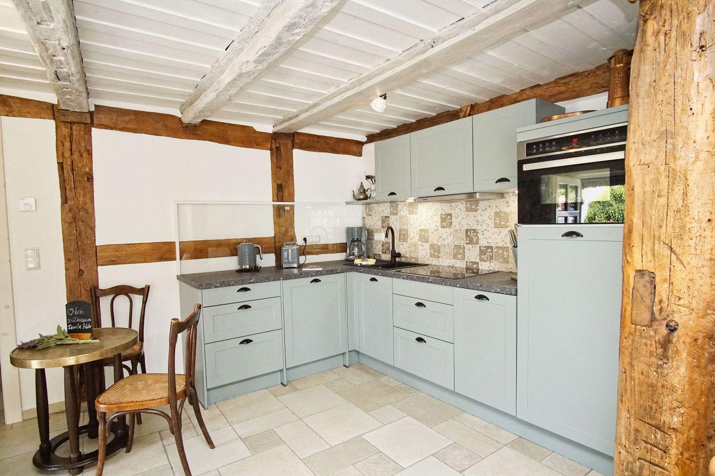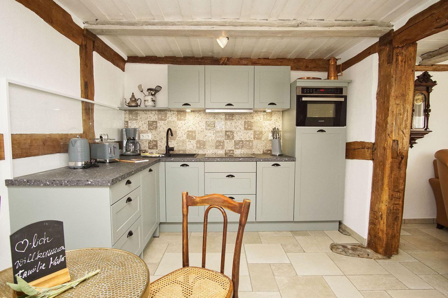 KÜCHE // offene Küche, 4-Platten Ceranherd, Spülmaschine, Kühlschrank mit Gefrierfach, Backofen, Toaster, Wasserkocher, Kaffeemaschine, reichlich Besteck, Geschirr und Küchenutensilien ++