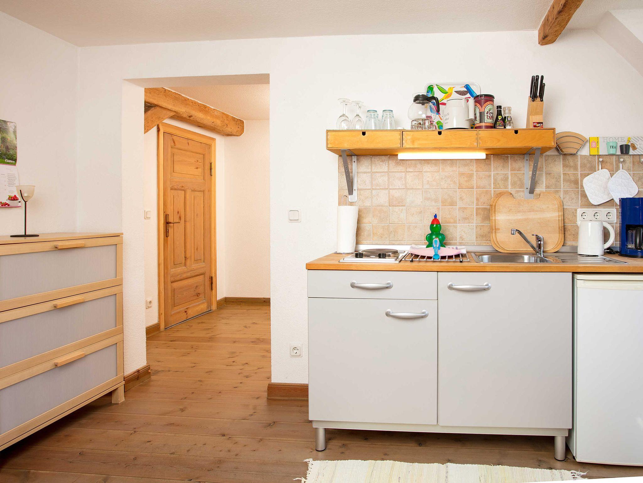 Die Ferienwohnung befindet sich im 2 OG. unseres Gutshauses und verfügt über einen Wohnraum und ein sep. Schlafzimmer, einen Flur sowie über ein Bad mit Badewanne.