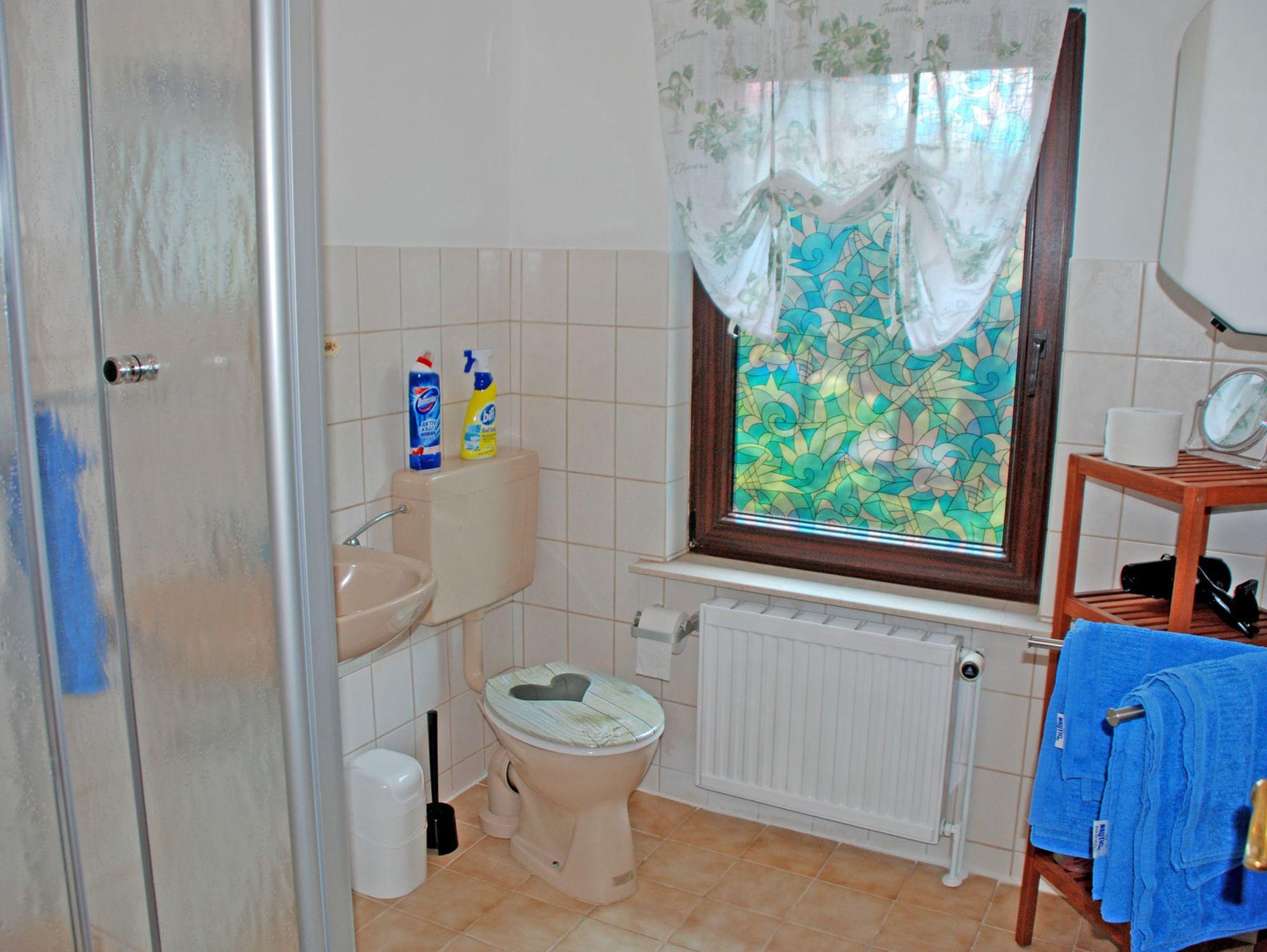 Das Bad verfügt über Dusche, WC, Waschtisch, Haartrockner und verfügt über Tageslicht..