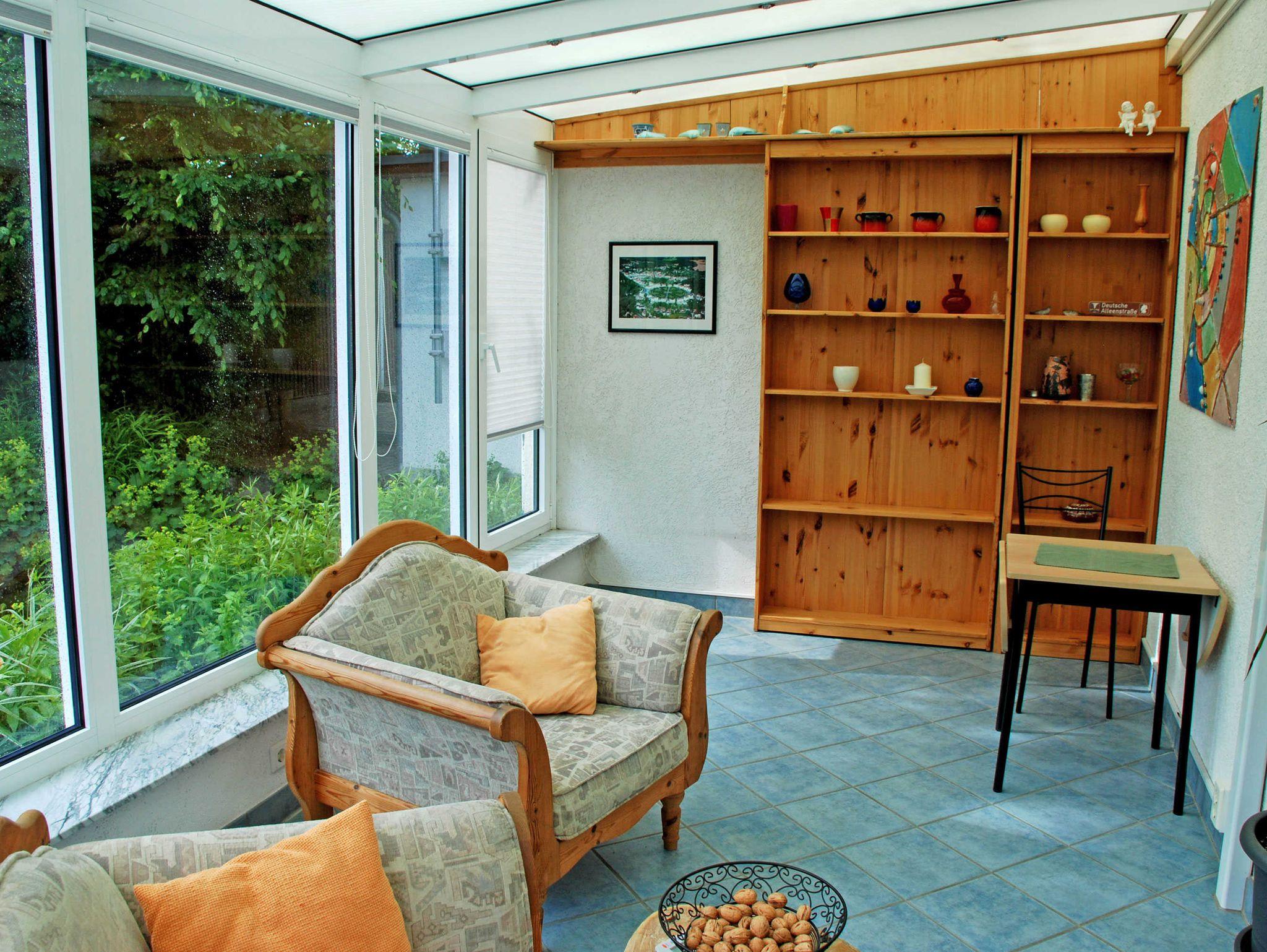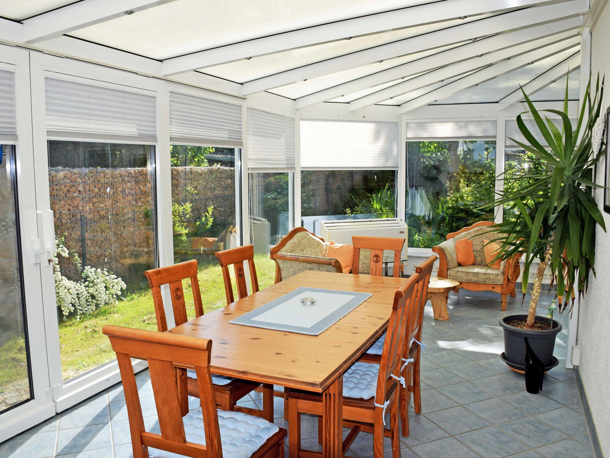 Die Ferienwohnung mit zwei separaten Schlafzimmern (1x Doppelbett 1,40 m breit, 1x Doppelbett 1,80 m breit, Schlafcouch 1,40 m breit und kleines Kinderbett), Wohn-/Schlafraum mit Schlafsofa (1,60 m breit) ist ca. 100 qm groß. Das Esszimmer mit Tisch und Stühlen sowie einer zweiten Leseecke mit 2 kuscheligen Sesseln befindet sich im Wintergarten (30 qm, Fußbodenheizung, Klimaanlage, Sonnenschutz). Vom Wintergarten und von einem Schlafraum gibt es einen direkten Zugang zum Garten mit Liegewiese und zur überdachten, möblierten Terrasse mit Grillplatz.