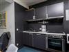 Ausstattung der Küche: 4-Zonen-Kochfeld, Backofen, Geschirrspüler, Filterkaffeemaschine, Wasserkocher, Toaster, Geschirr, Besteck, Pfannen und Töpfe.