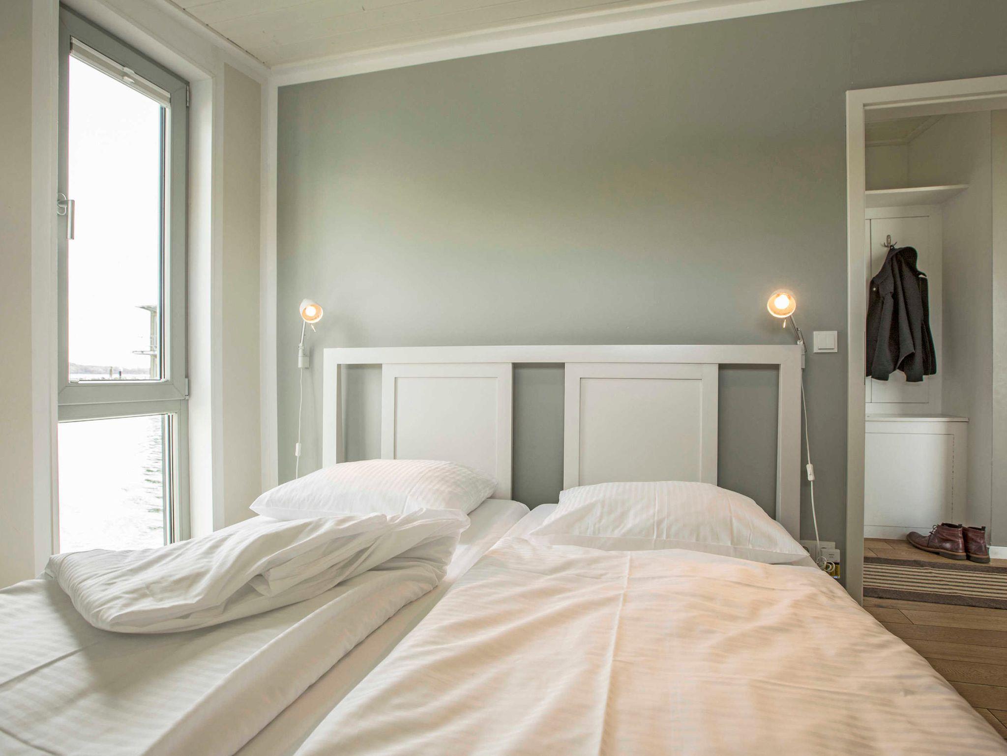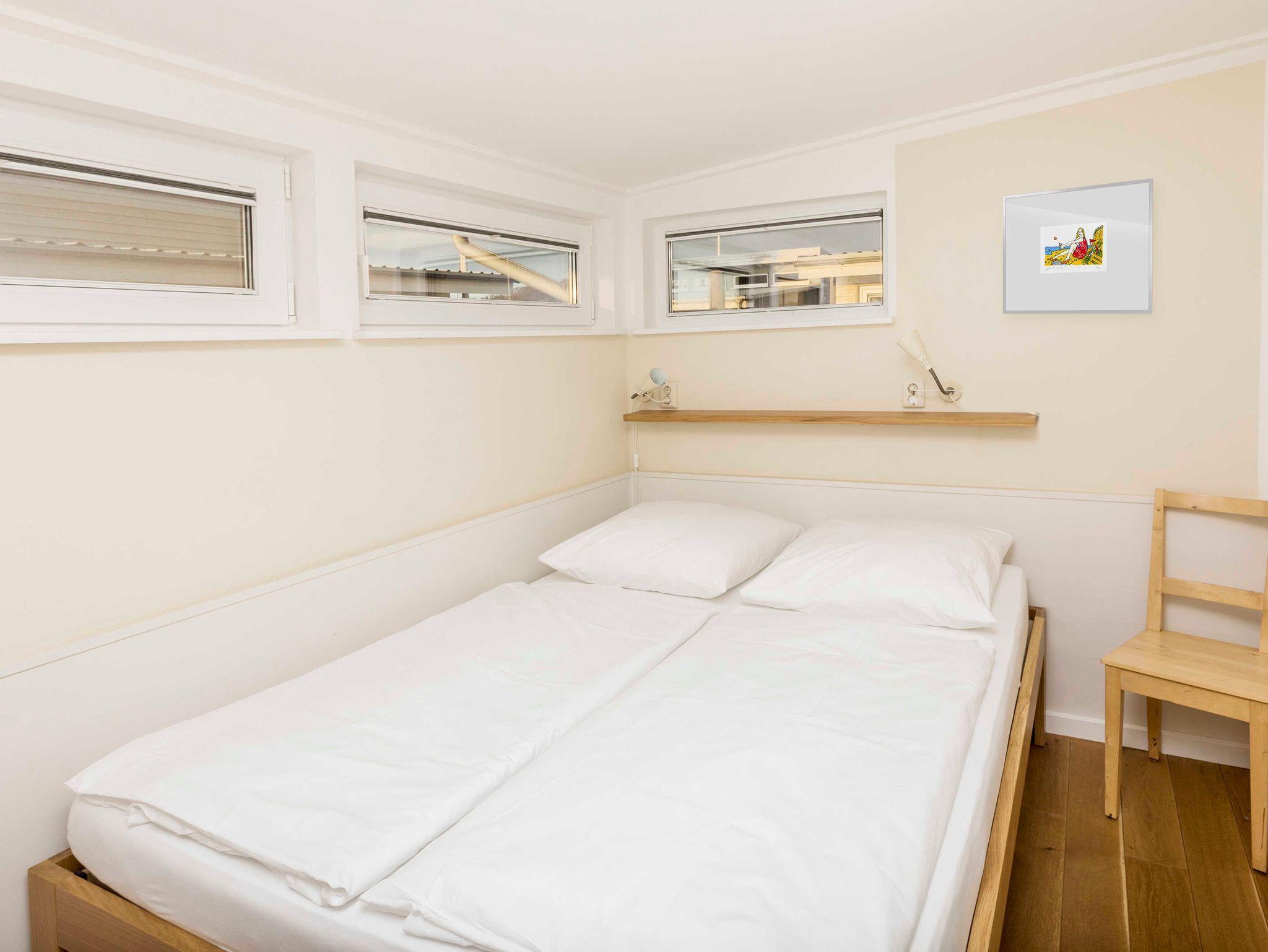 Ein Schlafraum mit Doppelbett, ein Wohnraum mit Aufbettung für zwei Personen (Schlafcouch). SAT-TV, Musikanlage, Küchenzeile, Dusche, WC, möblierte Terrasse, Bootsliegeplatz inkl.