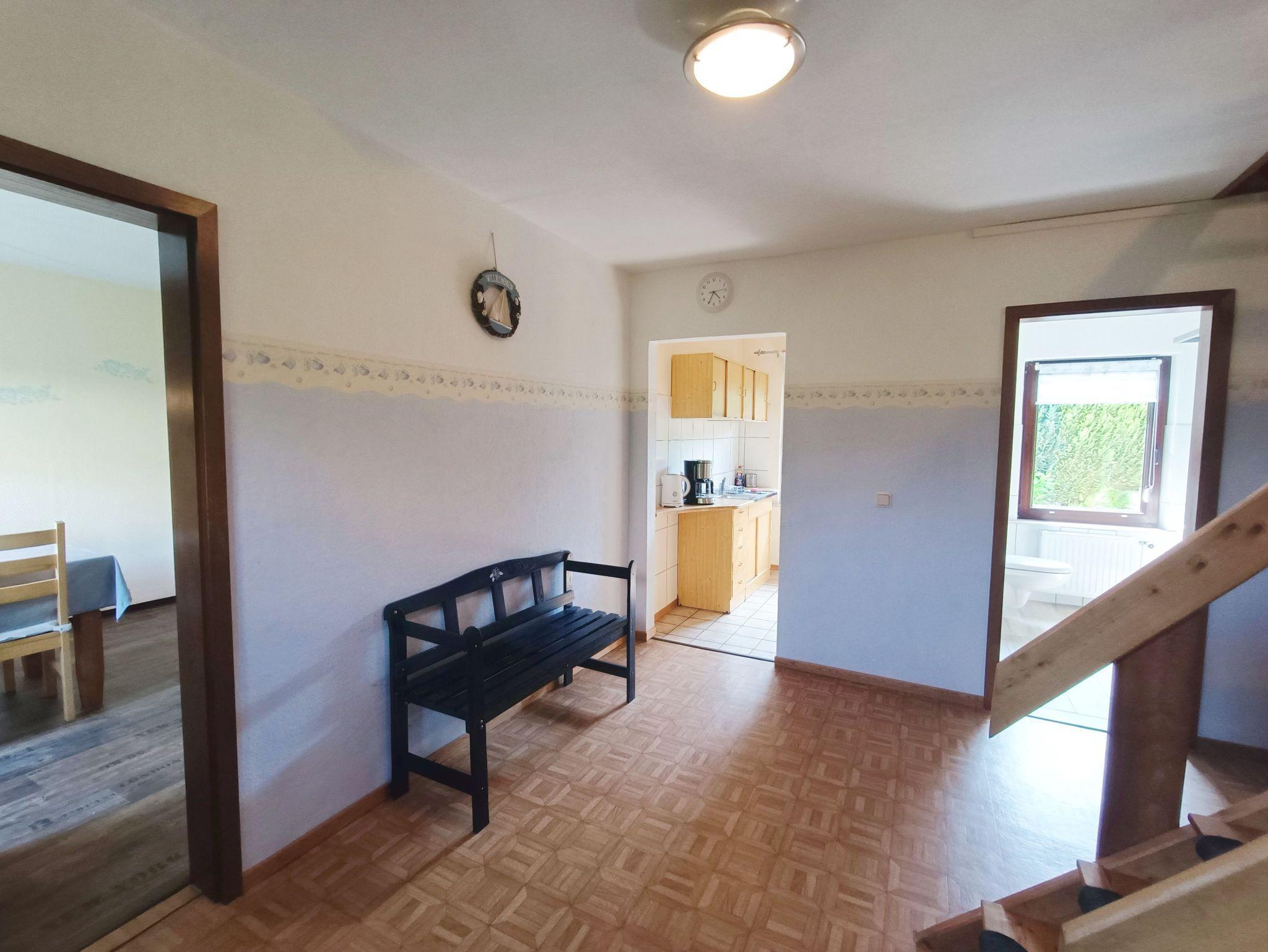 Über eine Treppe gelangt man in den oberen, gemütlichen Schlafbereich (Dachgeschoss). Hier stehen 4 bequeme Betten mit Nachtschränken, Leselampen und ein Kleiderschrank sowie ein zweiter Flachbild-TV. Ein kleines Kinderreisebett und ein Hochstuhl können auf Wunsch kostenlos zur Verfügung gestellt werden.