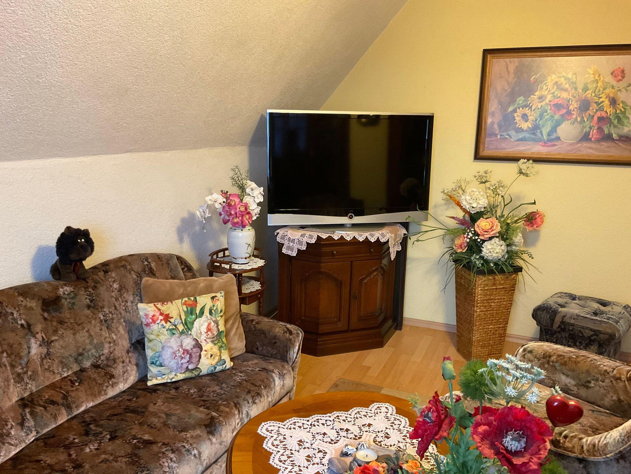 Die ca. 50 m² große Ferienwohnung im Obergeschoß bietet 2 Personen ausreichend Platz. Sie besteht aus einem Wohnraum mit Sitzgruppe dem Schlafraum mit dem Doppelbett. Die Küche ist in einem sep. Raum. Bad mit Dusche und WC.