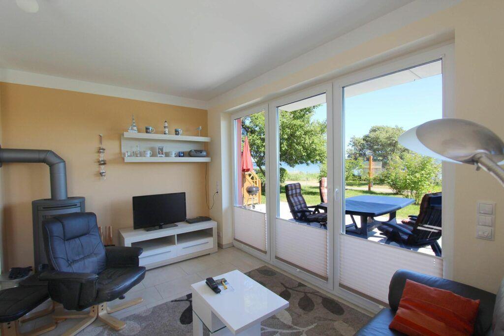 Im Erdgeschoss des Ferienhauses "Boddenblick" untergebracht, bietet diese 3 Zimmer Wohnung auf 50 m² Platz für bis zu vier Personen. Das Herz der Ferienwohnung bildet der gemütliche Wohnbereich mit voll ausgestatteter Küchenzeile. Bei Schietwetter machen Sie es sich auf der Couch bequem und genießen die wohlige Wärme des Kaminofens. Durch die Terrassenfenster bietet sich ein traumhafter Blick über den Greifswalder Bodden zur Insel Vilm.