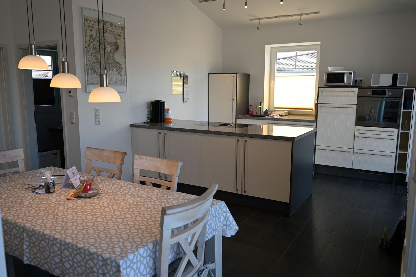 Die stilvolle 3-Raum Ferienwohnung für 4 Personen bietet auf ca. 117m² einen sehr großen, hellen Wohnbereich mit Fliesenboden, Sofaecke, Kamin, Essecke und offener, voll ausgestatteter Küche. Direkt vom Wohnbereich aus gelangen Sie auf die großzügige Terrasse. Genießen Sie den schönem Blick auf den Hafen von Lauterbach und die Insel Vilm.