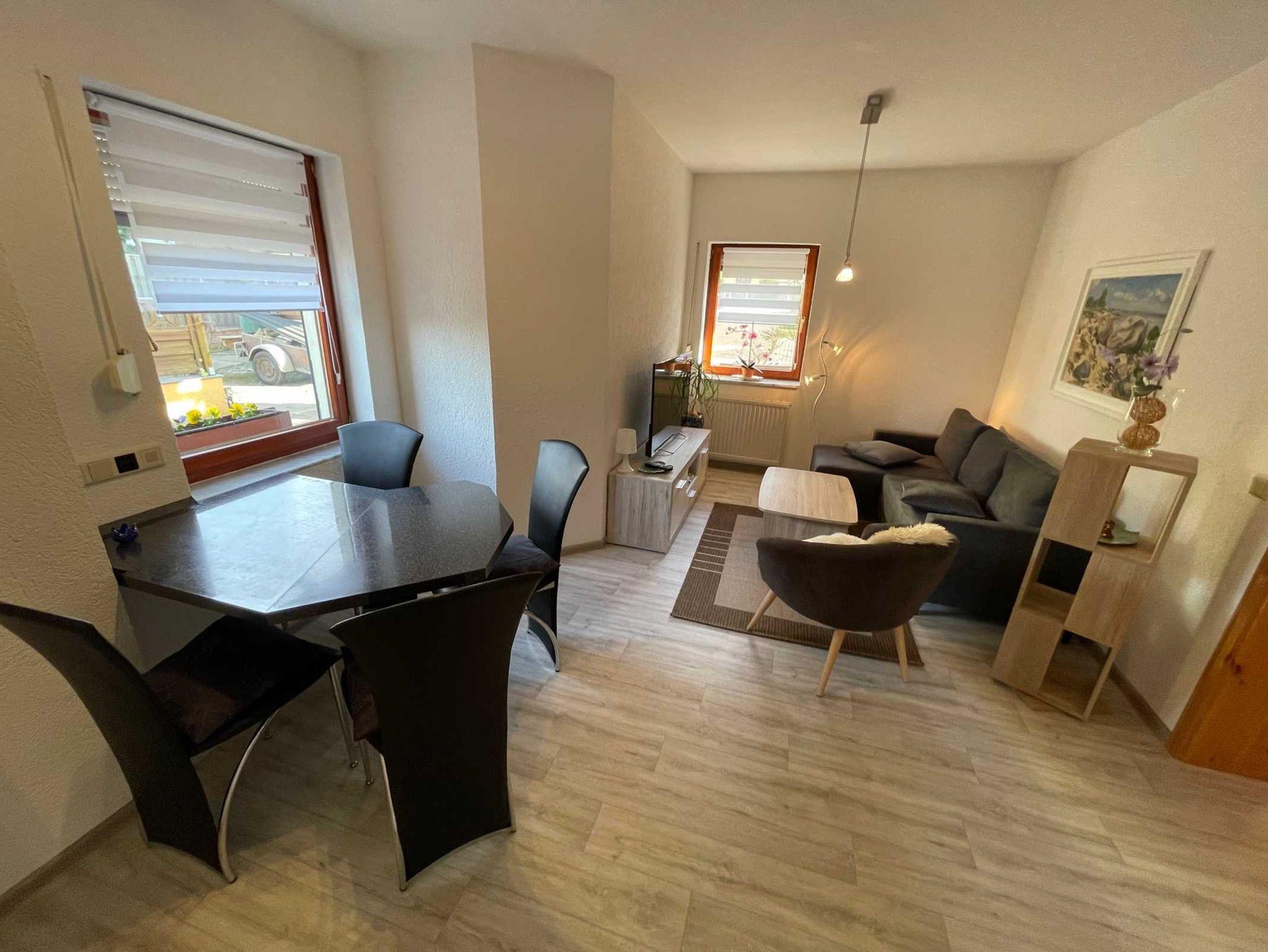 Die Ferienwohnung befindet sich im EG und hat einen sep. Eingang. Sie besteht aus einem Wohnzimmer mit Sitzgruppe, TV, der Küchenzeile mit dem Esstisch, zwei separaten Schlafzimmern mit Doppel bzw. Einzelbetten und dem Duschbad.