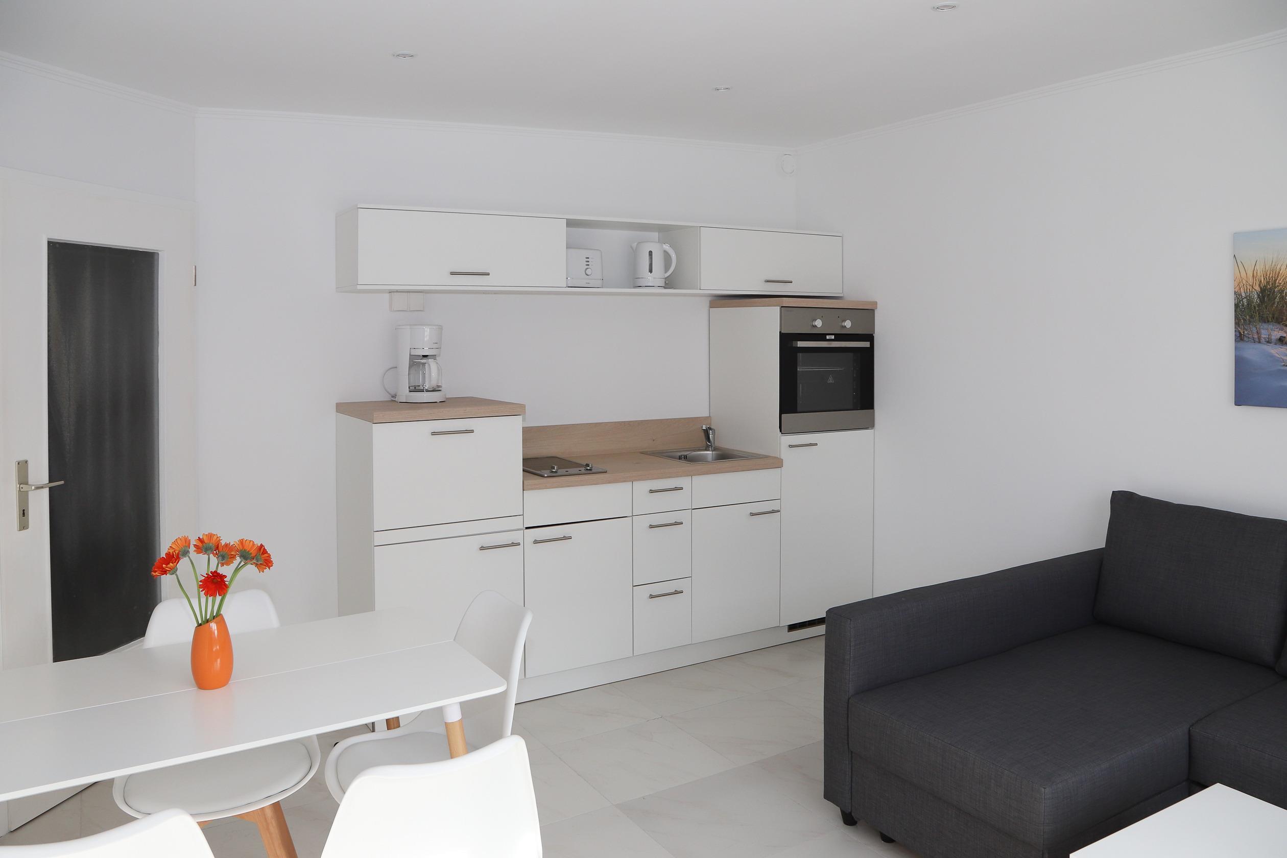Die neu modernisierte und möblierte Ferienwohnung befindet sich im 1.Obergeschoss. Sie besteht aus einen Wohnzimmer mit Küche und Esstisch, mit ausklappbarer Schlafcouch, einem Schlafzimmer mit Doppelbett und 1 Schlafzimmer mit Einzelbett und einem Duschbad.
