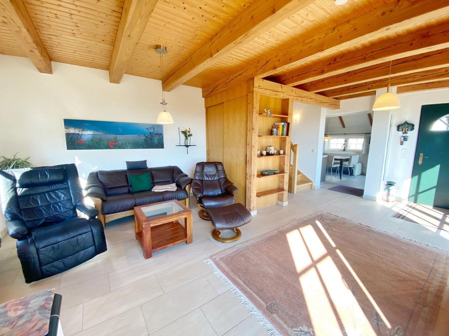 Im Erdgeschoß gibt es einen großzügigen Wohnbereich mit Kamin bzw. Kachelofen mit gemütlicher Ofenbank,