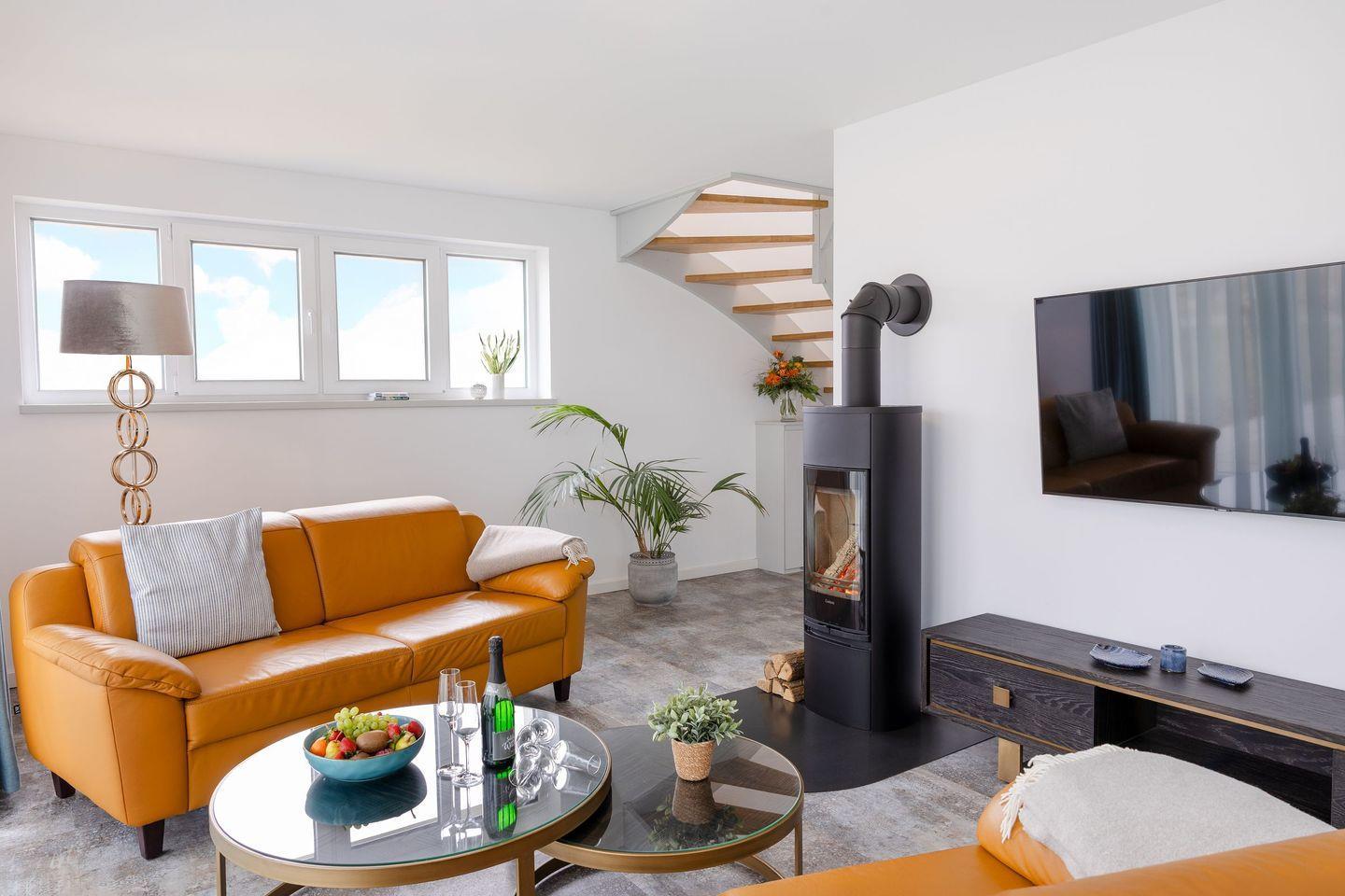 Die Unterkunft verfügt über insgesamt drei Zimmer, darunter zwei komfortable Schlafzimmer mit Parkettboden, die eine angenehme Schlafumgebung schaffen. Das Wohnzimmer ist mit einem Kaminofen ausgestattet, der für wohlige Wärme und eine behagliche Stimmung an kühleren Tagen sorgt. Eine Fußbodenheizung ist im gesamten Haus vorhanden und gewährleistet ein angenehmes Raumklima.