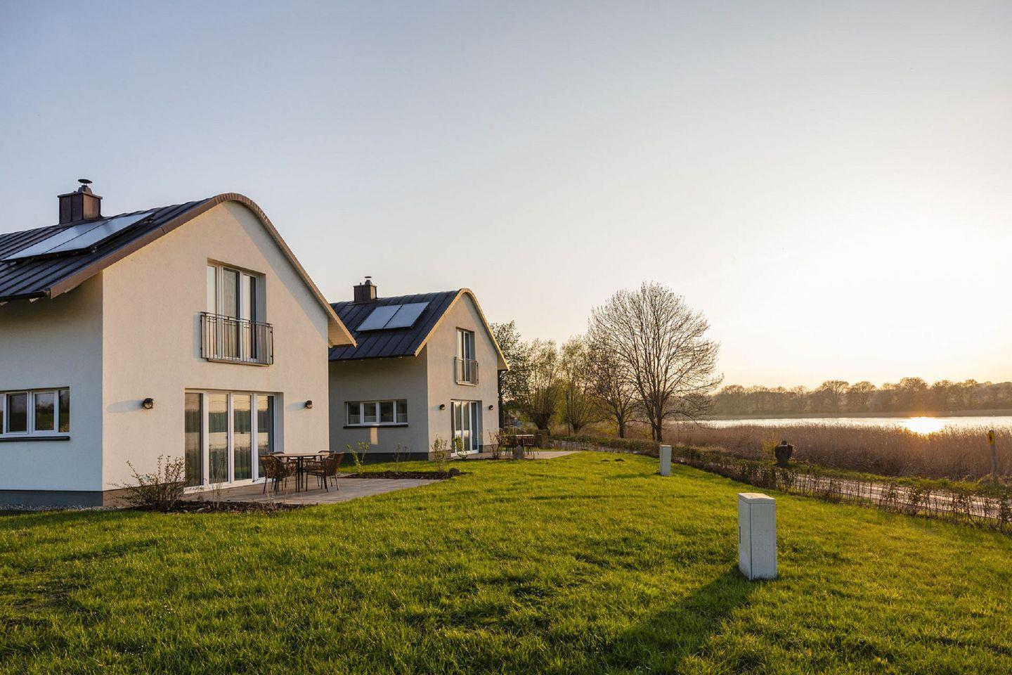 Modernes Ferienhaus Schilfhütte in ruhiger Lage am See mit Sauna, Kamin und Gartenblick für erholsamen Urlaub.