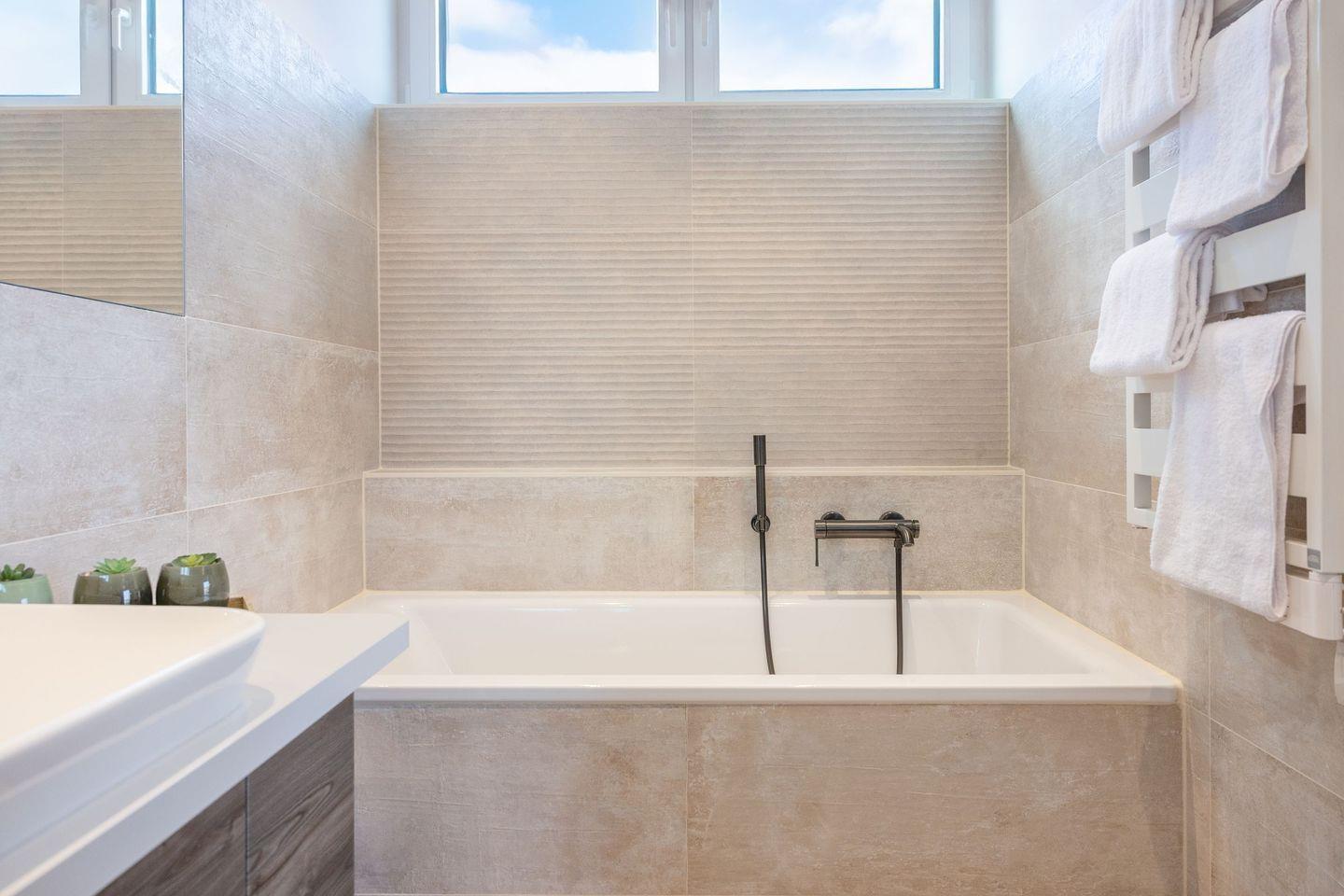 Ein modernes Badezimmer mit bodengleicher Dusche und Badewanne sowie ein zusätzliches Gäste-WC sorgen für zusätzlichen Komfort. Für behagliche Wärme sorgt die Fußbodenheizung.