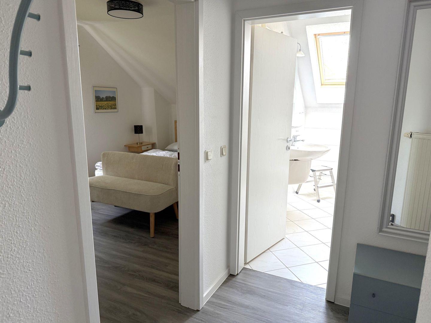 Die Ferienwohnung Julia befindet sich im Obergeschoss auf der Westseite des Hauses und bietet auf 45 m² eine gemütliche und einladende Unterkunft für bis 4 Personen. Die Kombination aus Dachschrägen, moderner Ausstattung und viel Tageslicht schafft eine warme, entspannte Wohnatmosphäre - ideal für Paare, kleine Familien oder Erholungssuchende.