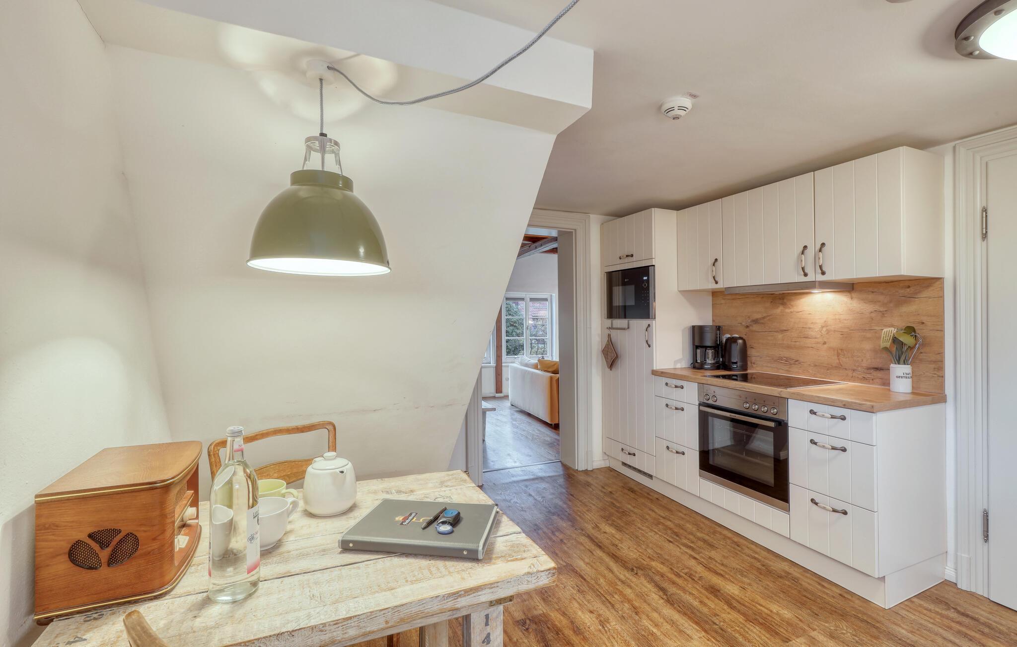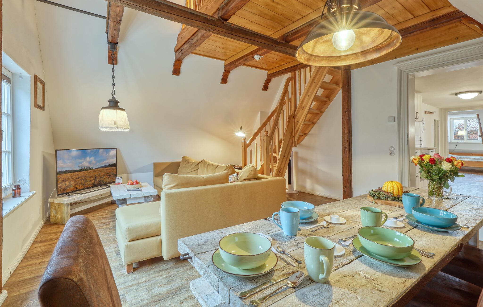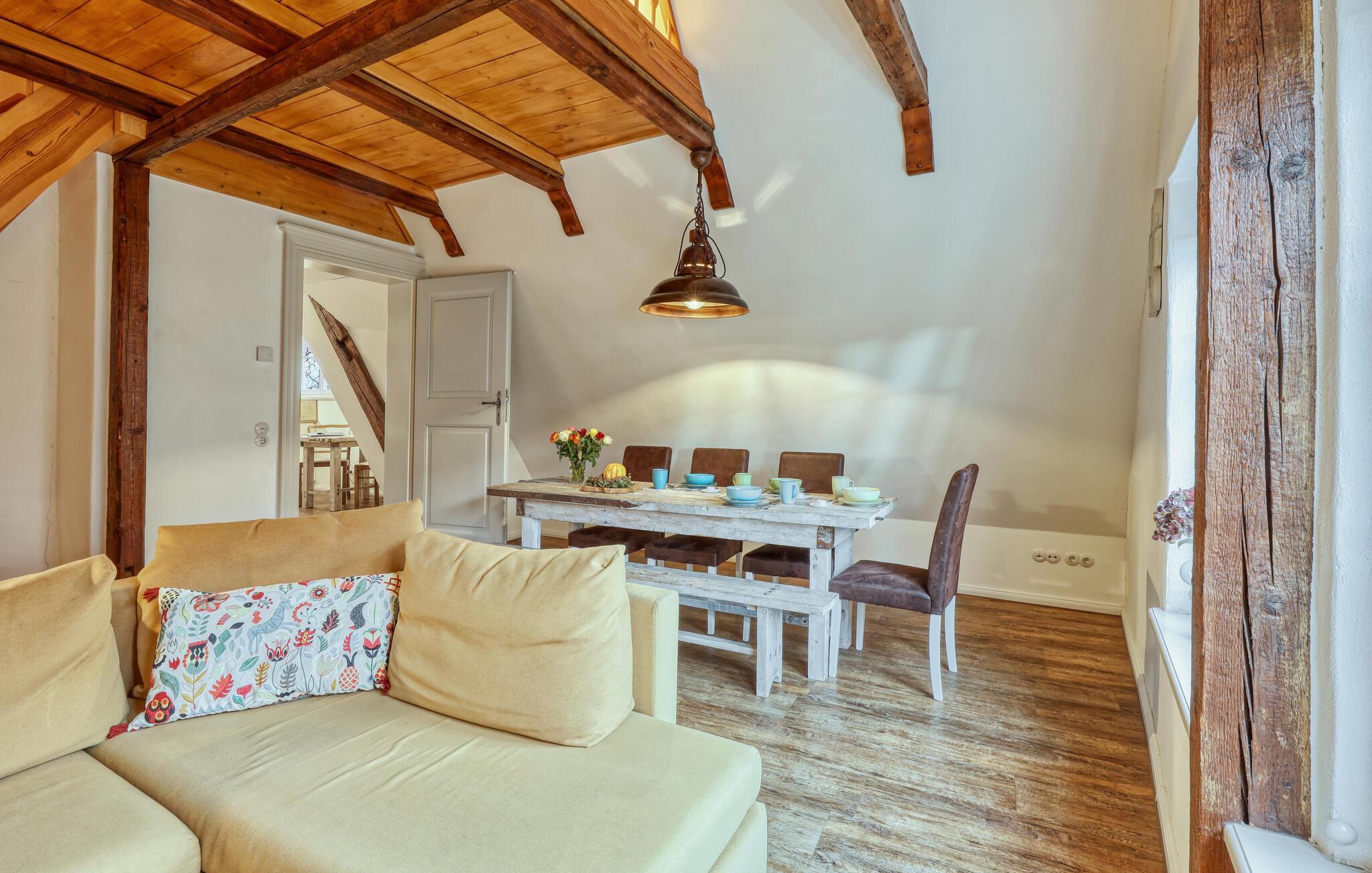 Die liebevoll eingerichtete Unterkunft kombiniert auf ideale Weise den Charme vergangener Zeiten mit modernem Komfort. Das gemütliche Wohnzimmer mit seinem bequemen Sofa bietet Ihnen einen schönen Rückzugsort nach einem erlebnisreichen Tag. Ob Sie ein spannendes Buch lesen, einen Film schauen oder einfach die Ruhe genießen – hier können Sie abschalten. In der gut ausgestatteten Küche lassen sich mühelos köstliche Mahlzeiten zubereiten, die Sie im hellen Essbereich mit Ausblick auf die Umgebung genießen können.
