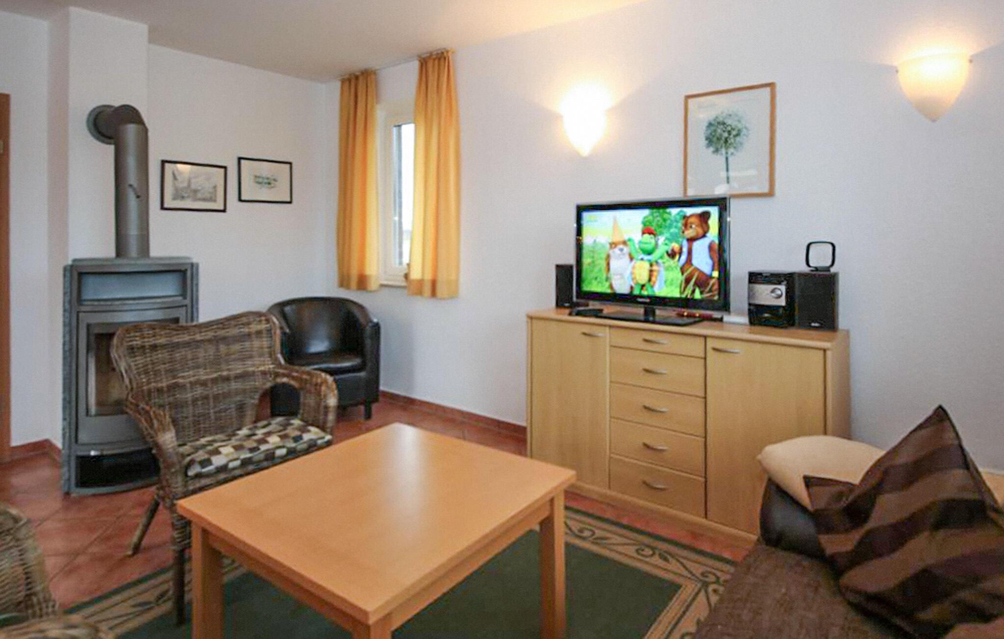 Genießen Sie einen entspannten Urlaub in Ihrem Ferienhaus, in dem Sie eine Kombination aus Gemütlichkeit, Natur und Erholung erwartet – ideal für Paare, Familien oder kleine Gruppen, die die Seenlandschaft Mecklenburgs erleben möchten. Der Wohnbereich mit bequemem Sofa und einem Kaminofen lädt zum Entspannen ein. Beobachten Sie das Flackern der Flammen an kühleren Abenden und genießen Sie die wohlige Wärme. Die offene Küche bietet gute Möglichkeiten, Ihre gemeinsamen Mahlzeiten zuzubereiten und am angrenzenden Essbereich zu servieren.