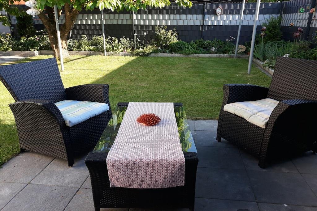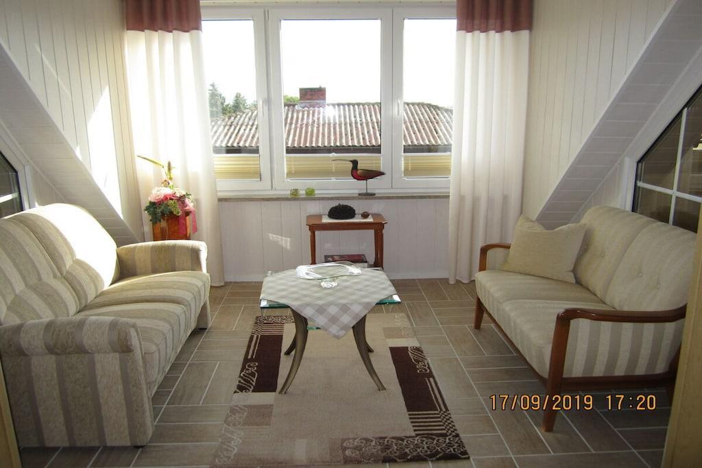 Die Nichtraucherwohnung liegt in der kompletten oberen Etage unseres Wohnhauses. Sie verfügt über einen großzügigen Wohn- und Küchenbereich. Es stehen zwei Sitzecken, ein Esstisch mit offener Küche sowie einer Fußbodenheizung zur Verfügung. Die Küche ist voll ausgestattet. Ein Parkplatz und eine Abstellmöglichkeit für Fahrräder sind vorhanden. W-LAN kann kostenlos genutzt werden. Haustiere sind nicht gestattet. Eine kleine Sitzecke kann im Garten genutzt werden. 2 Fahrräder mit 7-Gang Schaltung, Marke Pegasus, können für 6,00 Euro / Tag gemietet werden.