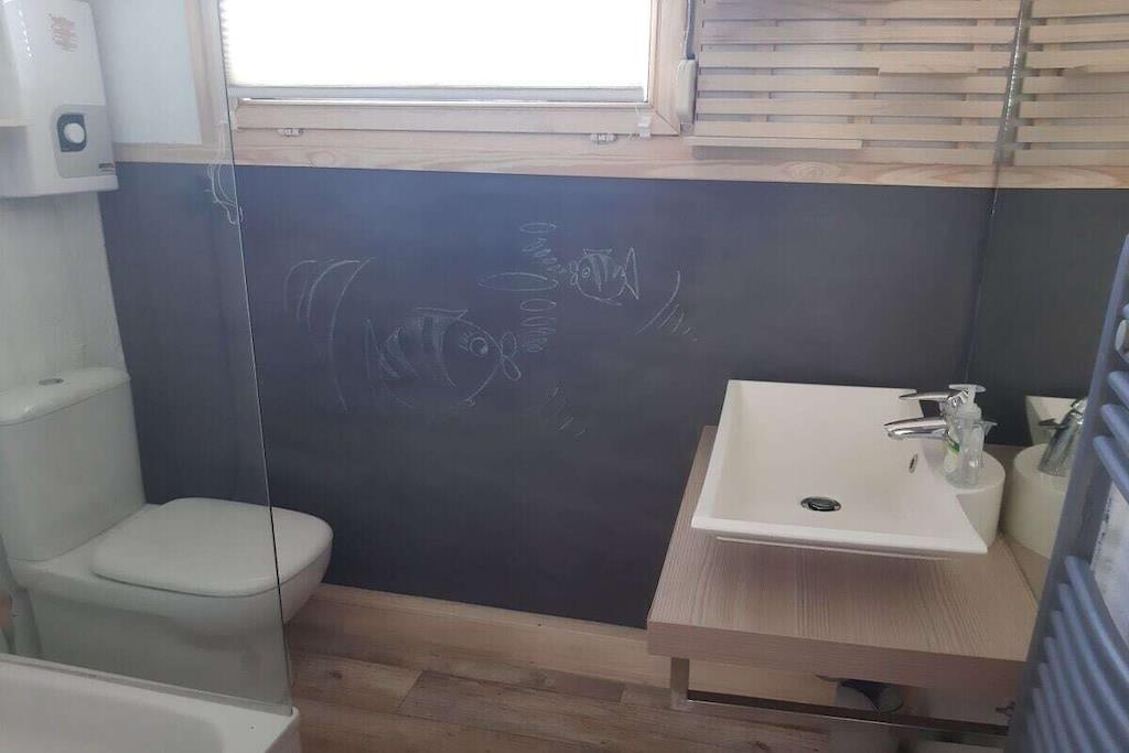 Parterre: (Wohnzimmer(TV, Kaminofen), Küche(Kochplatte, Spülmaschine, Kühlschrank), Schlafzimmer(, , Doppelbett), Schlafzimmer(, , Einzelbett, Babybett), Badezimmer(, Toilette, Dusche, Waschbecken, Heizung)) , , , Erste-Hilfe-Station, Terrasse(, Gartenmöbel)