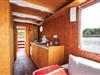 Sie betreten das Hausboot über die offene Terrasse am Bug und gelangen so in den Wohnbereich mit Steuerstand. Hier befinden sich auch die bequeme Schlafcouch, ein Flachbildschirm mit Bose Soundsystem und der Essbereich. Der Wohnraum grenzt an die Schlafnische mit Etagenbett an und geht in die offene Miniküche mit Elektrokühlschrank über. Angrenzend befinden sich der Hauptschlafraum mit Doppelbett und ein kleiner, separater WC-Raum mit elektrischem Abzug und Handwaschbecken. Eine Warmwasserdusche befindet sich außen am Heck.