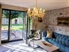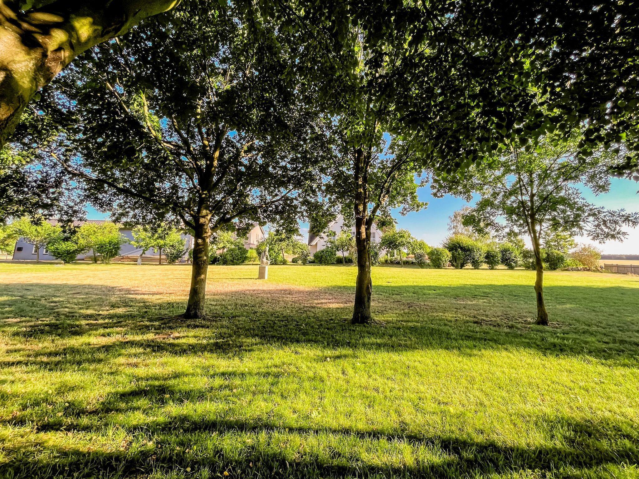 Genießen Sie von Ihrer privaten Terrasse, ausgestattet mit Gartenmöbeln, Sonnenschirm und Sonnenliegen, den Blick auf den gepflegten, idyllischen Außenbereich mit weitläufigen Wiesen und altem Baumbestand. Die ruhige Umgebung lädt zum Verweilen und Entspannen ein.