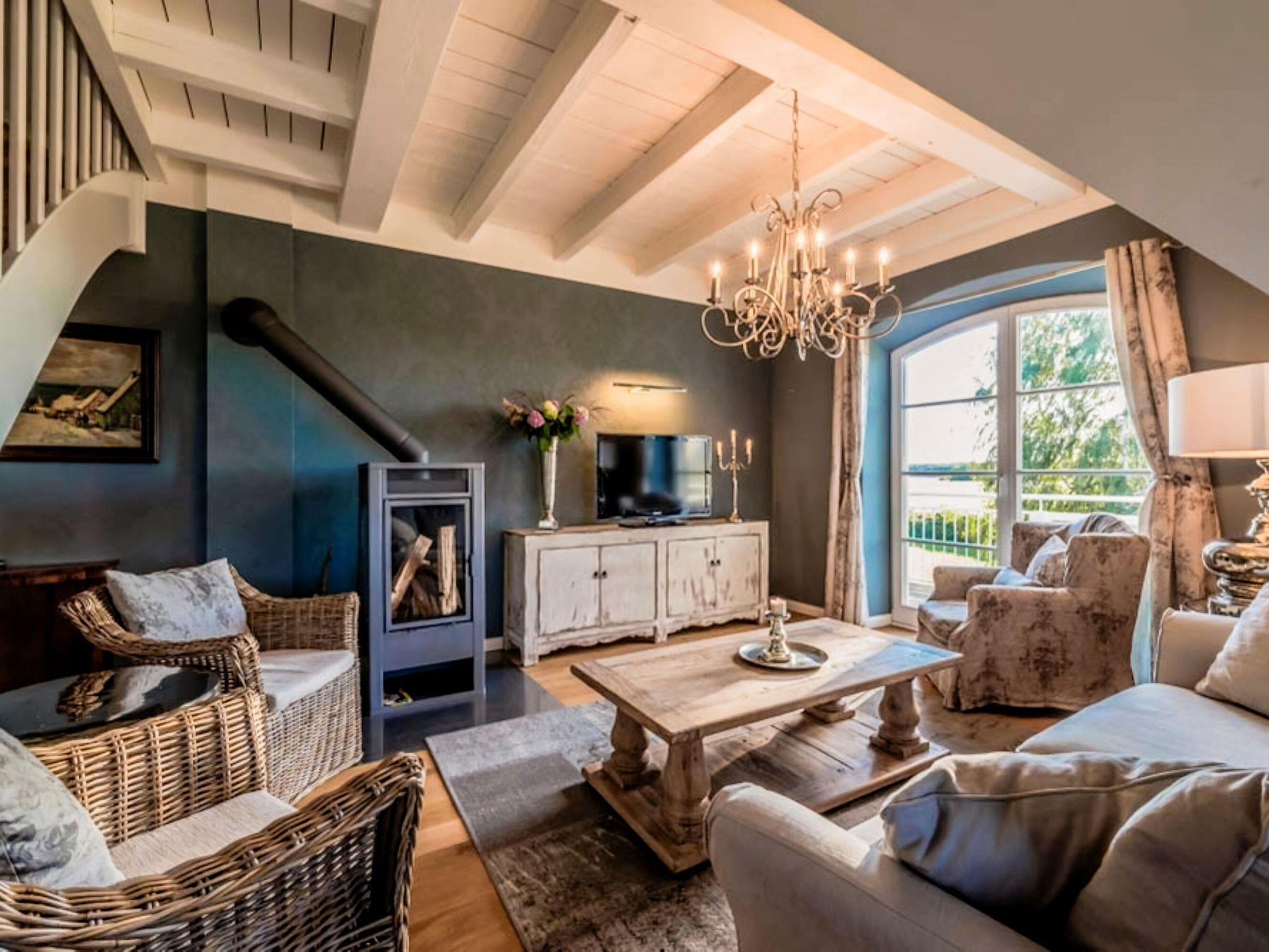 • Wohnzimmer im Landhausstil: Genießen Sie den Holzdielenboden, die behagliche Fußbodenheizung und einen gemütlichen Sitzbereich mit Kamin und TV-Flatscreen der perfekte Ort zum Entspannen.