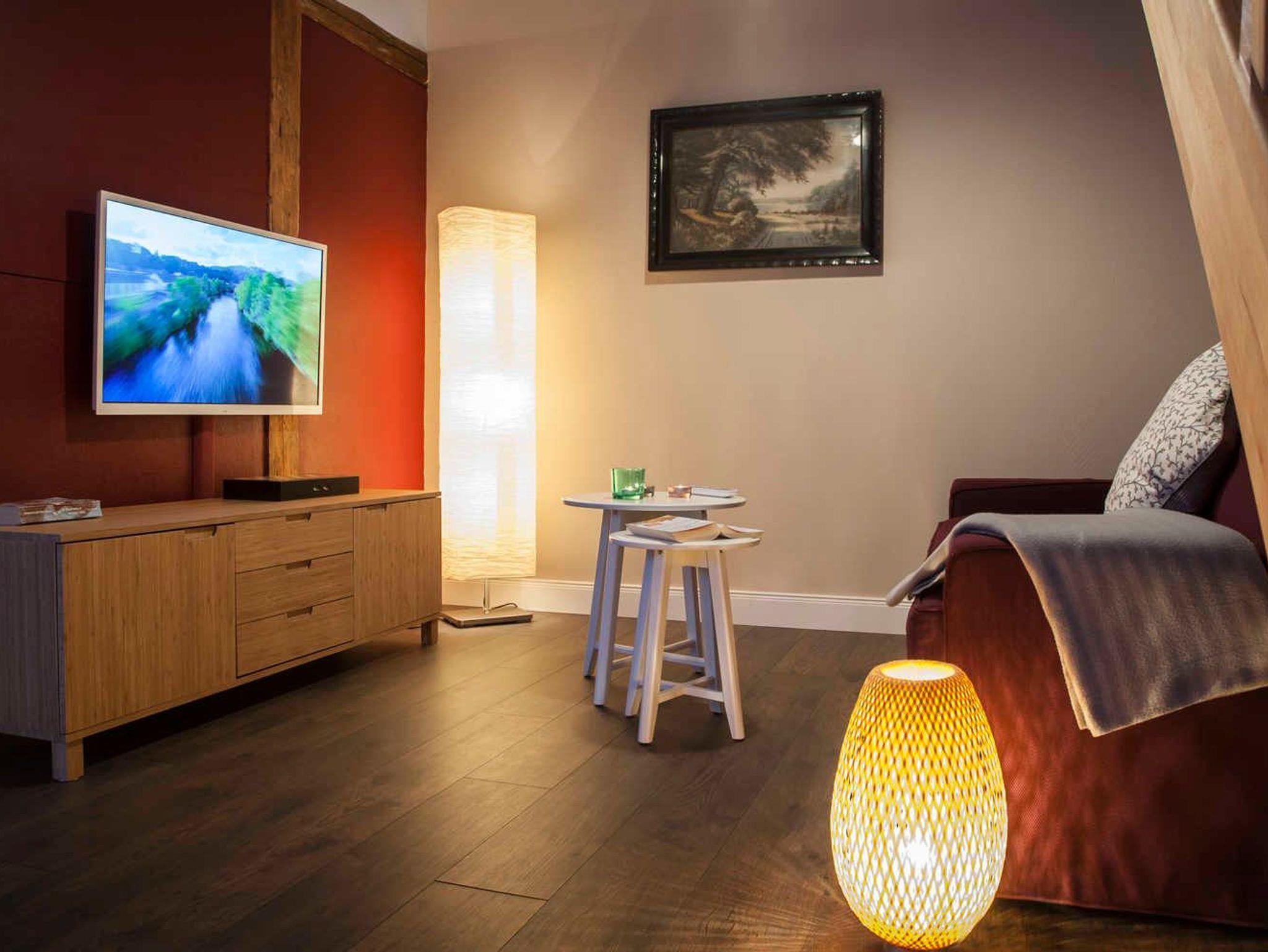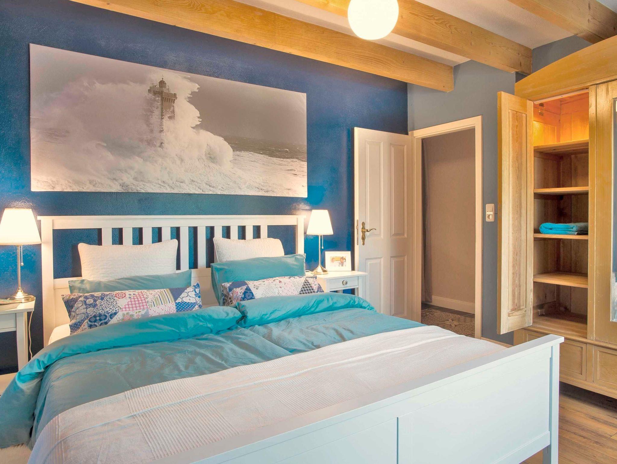 Der Parkplatz der Wohnung liegt unmittelbar vor der 32 m² großen Südwest-Terrasse die mit Holzmöbeln und Kissen ausgestattet ist. Die ca. 61 m² große Wohnung erstreckt sich über 2 Etagen. Im EG der Wohnung befindet sich der offene Wohnraum mit Küche, Esstisch und gemütlichem Sofa mit Blick auf den 40 Flachbildfernseher. Das Sofa lässt sich mit wenigen Handgriffen zum bequemen Doppelbett ausziehen. Eine Musikanlage mit CD-Player und USB-Anschluss sorgen für Unterhaltung und gemütliche Entspannung. Die Hochglanzeinbauküche lässt keine Wünsche offen. Sie umfasst Kühlschrank inkl. Gefrierfach, Spüle, Geschirrspüler, Vitrine mit Geschirr und Gläsern, einen Herd mit Cerankochfeld und Tastbedienung, einen Backofen sowie zwei Unterschränke mit Schubladen. Die Küchenausstattung ist komplett mit Töpfen und Pfannen und allen zum Kochen notwendigen Utensilien wie: Kartoffelstampfer, Dosenöffner, Korkenzieher, Sparschäler, Mixstab, Kochlöffel, Knoblauchpresse, anständige Messer etc. Ein Kaffeevollautomat der Firma Saeco und ein Milchaufschäumer zaubern einen perfekten Latte Macchiato. Zusätzlich gibt es einen Wasserkocher und Toaster. Das Geschirr und Besteck sind für 12 Personen damit der Geschirrspüler auch gefüttert werden kann. Außerdem gibt es Espressotassen, Milchkaffeetassen, Müslischalen und zum Teil antike Servierschüsseln und Platten. Der Essbereich grenzt an die Küche. Über dem Holztisch mit 4 antiken Stühlen thront ein wunderschöner Kronleuchter mit 12 Leuchten, der stufenlos gedimmt werden kann. Die Wohnung erstreckt sich über zwei Etagen. In die 1. Etage führt eine Holztreppe in einen kleinen Flur. Von hier aus geht es in das Bad und das Schlafzimmer. Das Badezimmer mit weißen Hochglanzfliesen ist ausgestattet mit einer Badewanne und Regendusche, einem Waschtisch mit zwei Schubladen, einem großen Spiegel mit zwei zusätzlichen Leuchten und einem Handtuchheizkörper. Es liegt ein Föhn mit Diffuser bereit sowie pro Person ein Bade- und ein Handtuch. Das Schlafzimmer ist ausgestattet mit einem Doppelbett (180 x 200) und einer wundervoll dicken Matratze. Jede Bettseite hat einen Nachttisch mit einer Lampe und davor einen flauschigen Teppich. Ein antiker Kleiderschrank mit Innenbeleuchtung und zwei Kommoden bieten viel Stauraum.