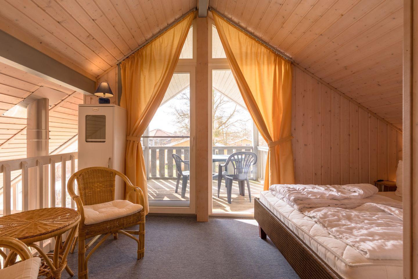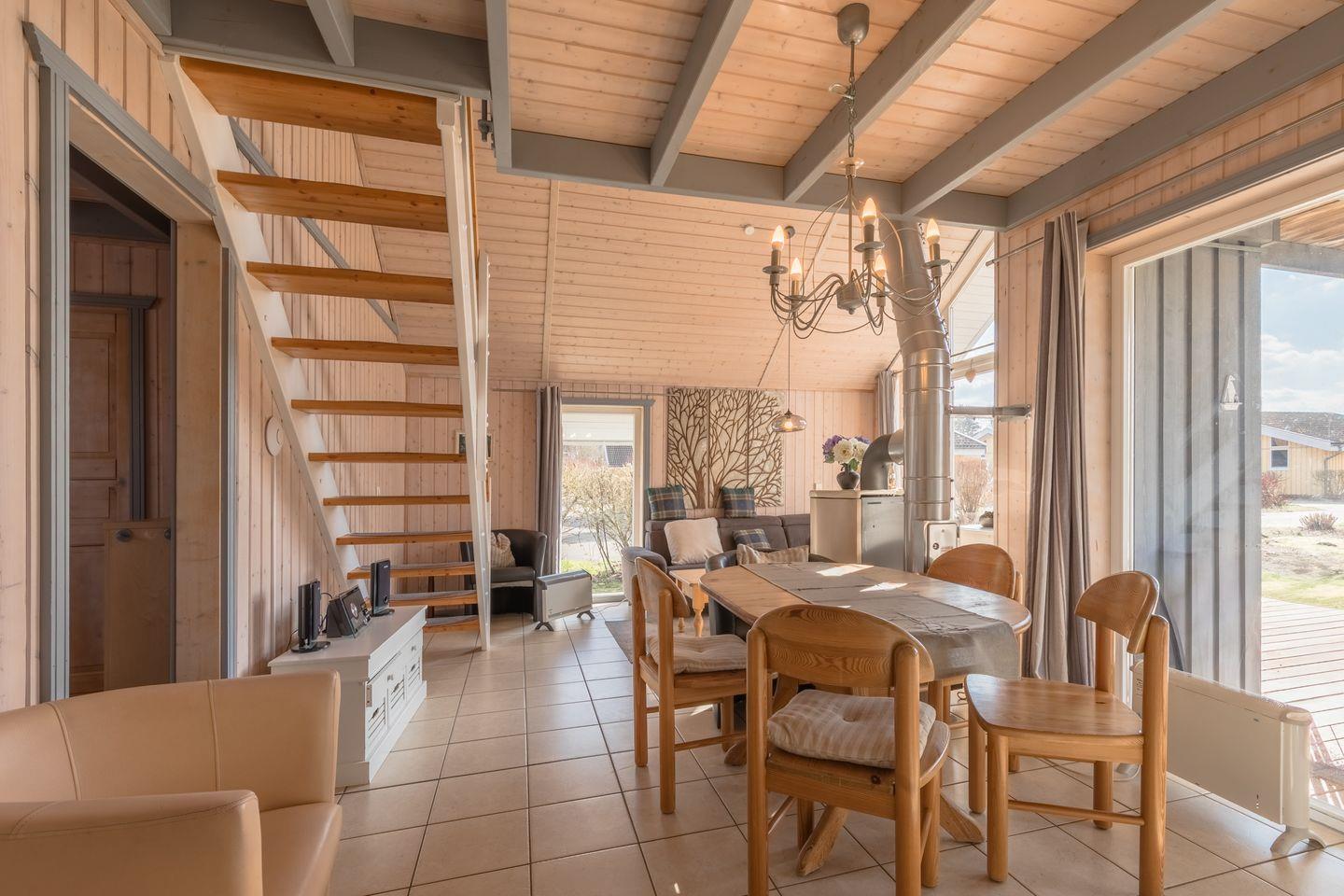 Das Ferienhaus im skandinavischen Stil bietet Platz für bis zu 6 Personen auf 2 Etagen mit 2 Schlafzimmern und offener Schlafgalerie, Wohn-/Essbereich, Einbauküche, Badezimmer mit Sauna und Whirlpool, Pkw-Stellplatz und Terrasse.