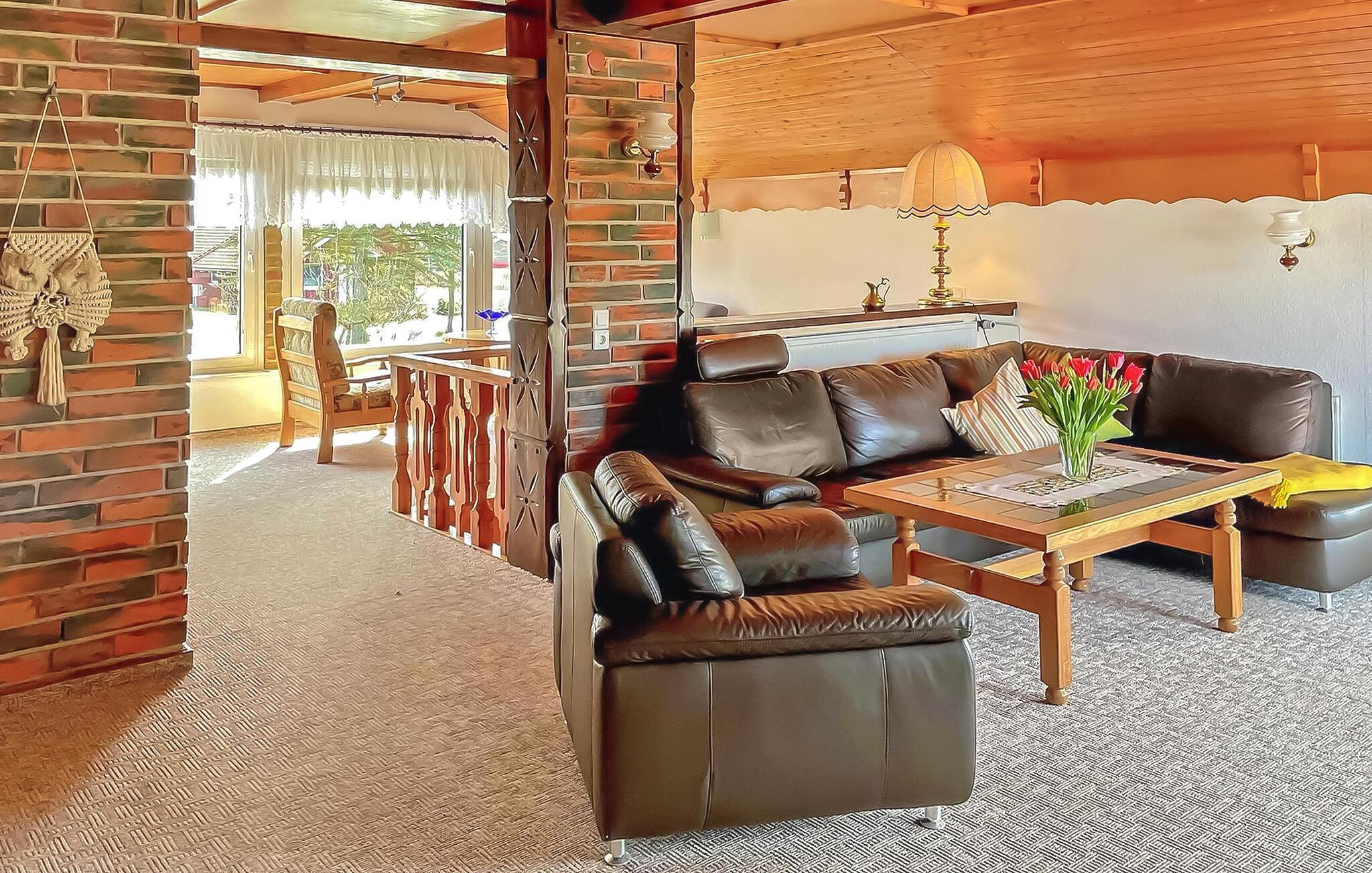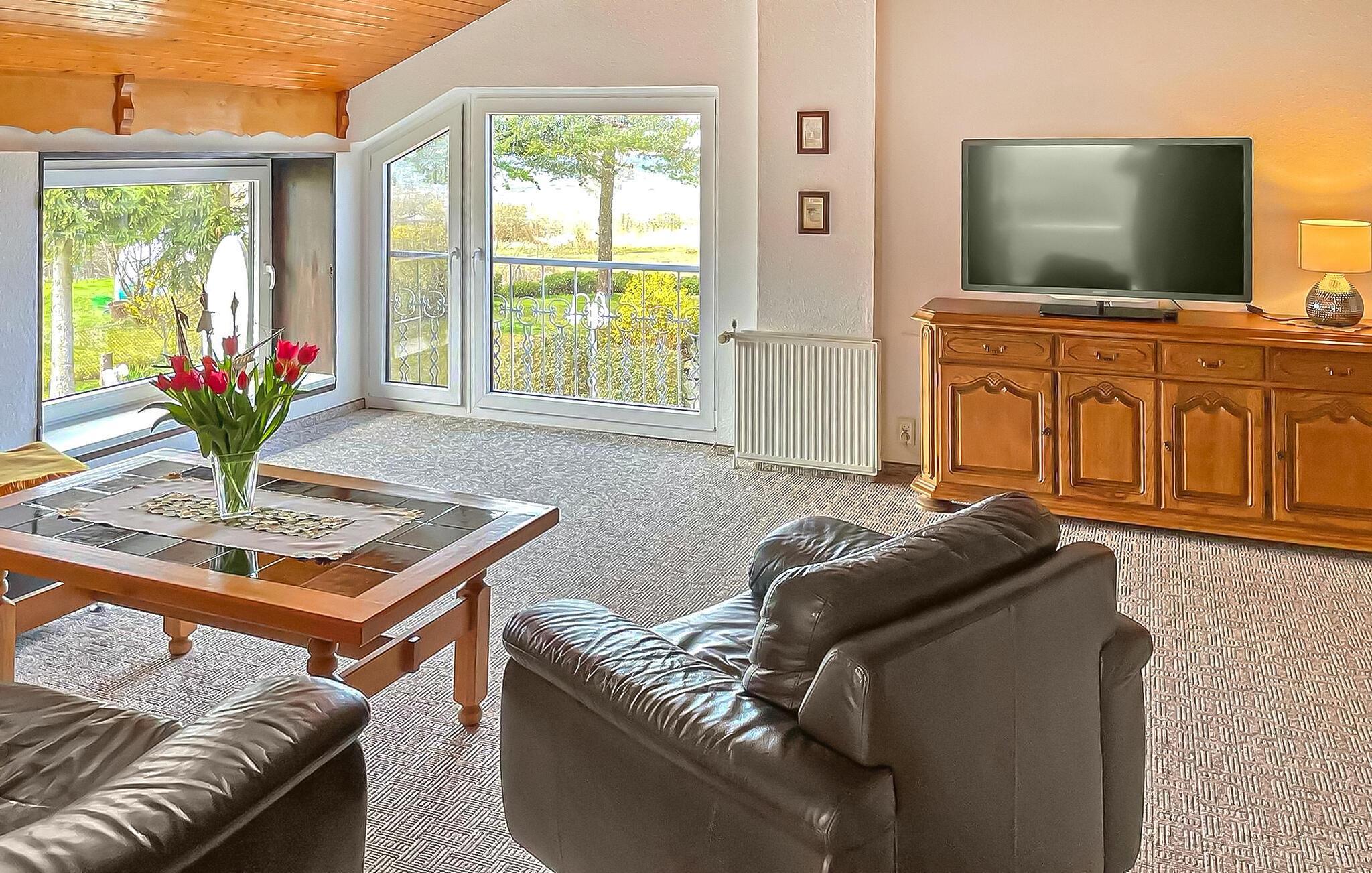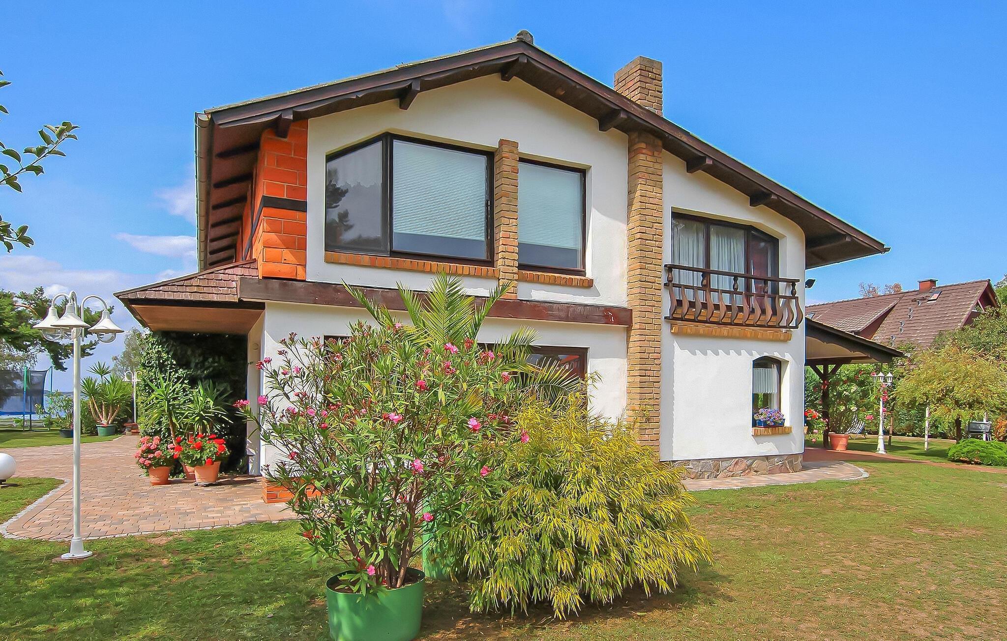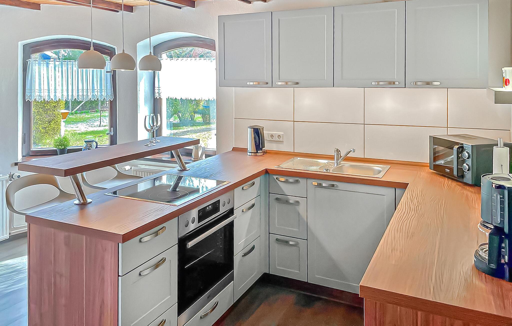 Die ca. 130 qm große, familienfreundliche Nichtraucher-Ferienwohnung mit separatem Eingang erstreckt sich über zwei Etagen. Im Erdgeschoss gibt es einen großen Flur mit Essbereich, eine neu ausgestattete Küche (Esstheke, Elektroherd mit Backofen, Geschirrspüler, Kühlschrank mit Gefriermöglichkeit, Mikrowelle, diverse kleine Küchengeräte), ein Schlafzimmer (2 Einzelbetten) und ein Badezimmer mit Dusche/WC. (Küche und Schlafzimmer jeweils mit Ausgang zur Terrasse). Vom Flur führt die Treppe in die obere Etage mit großem Wohnzimmer (Schlafsofa; Zusatzbett für zwei Personen, kleine Sitzecke, TV); von dort Blick auf die Müritz, ein weiteres Schlafzimmer (Doppelbett) und ein zweites Badezimmer mit Dusche/WC. (Achtung: Schräglage, geringe Durchfahrtshöhe). Die Wohnung wird zentral beheizt und ist mit Insektenschutz an den Fenstern ausgestattet. Außerdem gibt es eine große möblierte und komplett überdachte Terrasse, Grill, Sonnenliegen, Sitzgelegenheiten auf dem großen Grundstück, Parkplatz, Fahrradkeller, Kinderbett und Hochstuhl sowie kostenfreies WLAN.